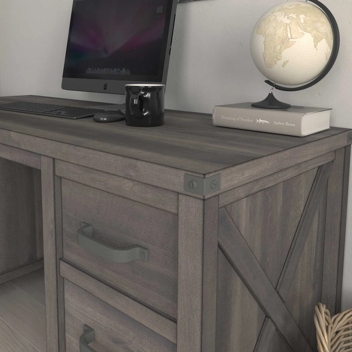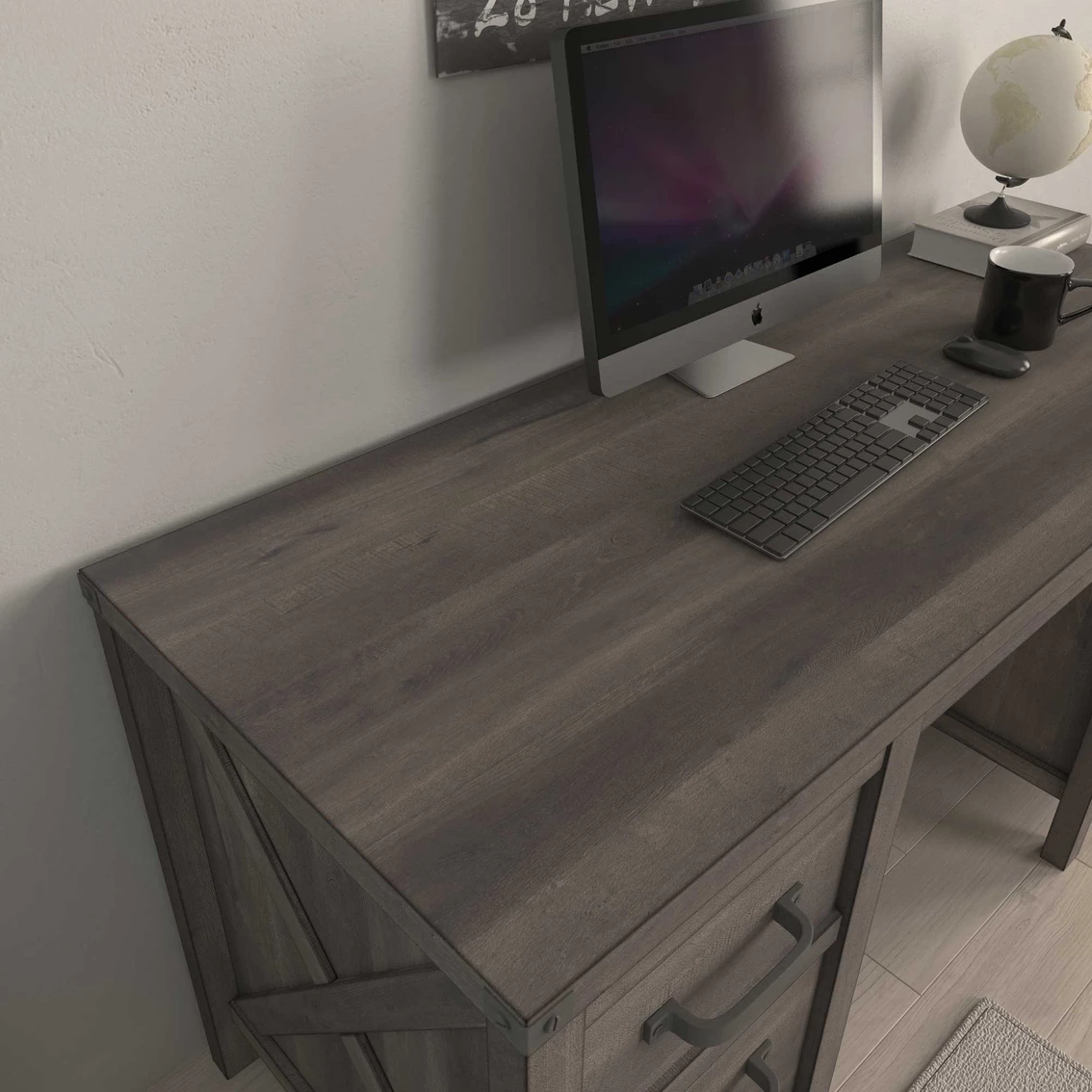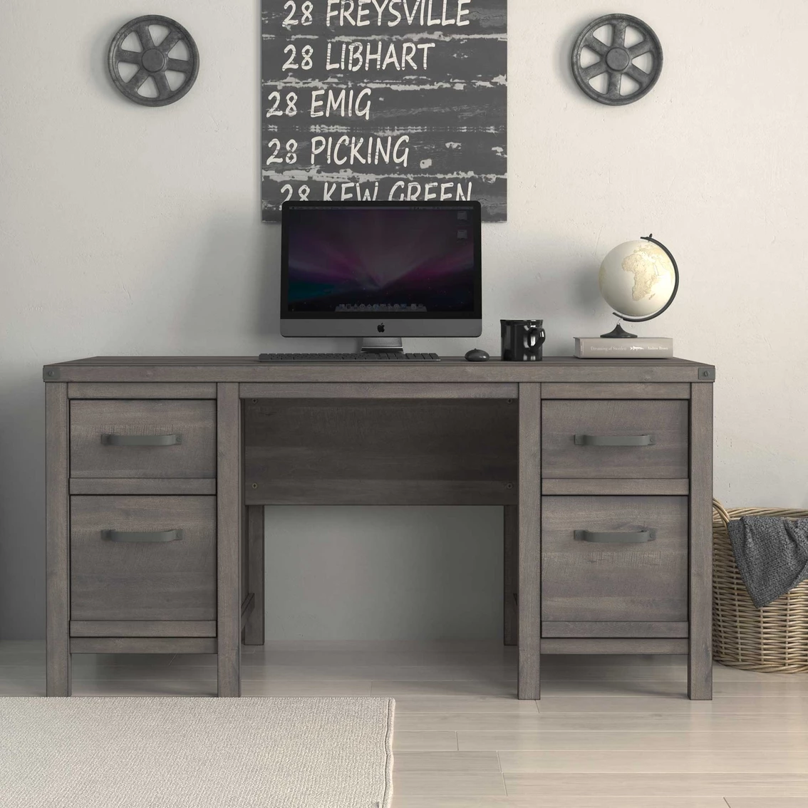 This Accentrics Home double-pedestal, 4-drawer desk exudes modern farmhouse styling, from the the barn door detail on the side panels to the weathered oak finish. This is all complimented with smooth-finished drawer pulls and metal corner accents. The desktop can accommodate your laptop, printer, and paperwork. It is perfect for working at home, study time and other home activities. With four spacious drawers, storage will not be an issue. The desk ships directly to your door in one box and requires assembly. Donβt worry, assembly can be done in 30 minutes or less. Model; J006-910-005.