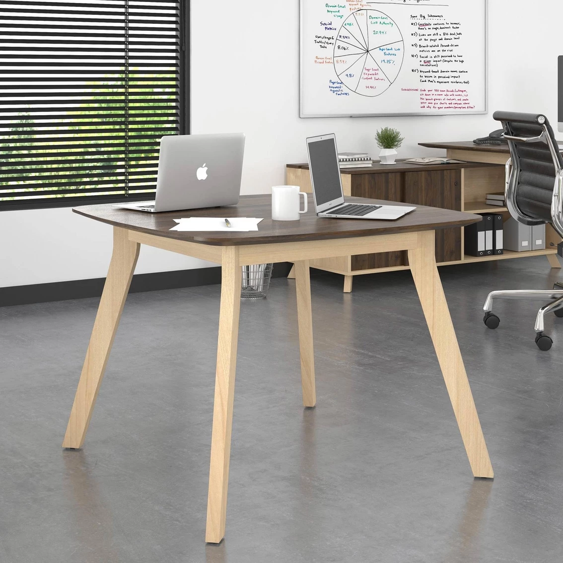 Set up small meetings in your office with the Ameriwood AX1 Square Meeting Table. This table is perfect for 2 – 4 people to congregate around and bounce ideas off of one another. When you’re not in a meeting use it as extra work space to layout projects and paperwork. The mid-century style of the walnut durable melamine finish and light wood legs will bring a whole new style to your office space. At the bottom of each leg are adjustable levelers so your table won’t wobble on uneven surfaces. Complete your collection with the AX1 L-Shape Desk, Mobile File Cabinet, and locking Storage Cabinet. The AX1 collection has been tested and meets ANSI-BIFMA standards. The Meeting Table measures to be 29.53 in. H x 39.37 in. W x 39.37 in. D and requires minimal assembly upon opening. It is recommended that 2 adults assemble and move this item. Model: 9810096COM.