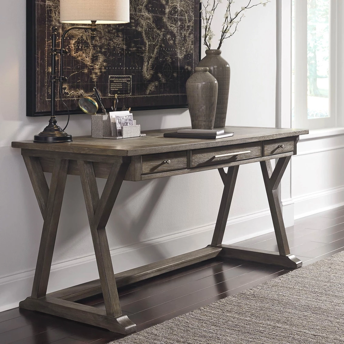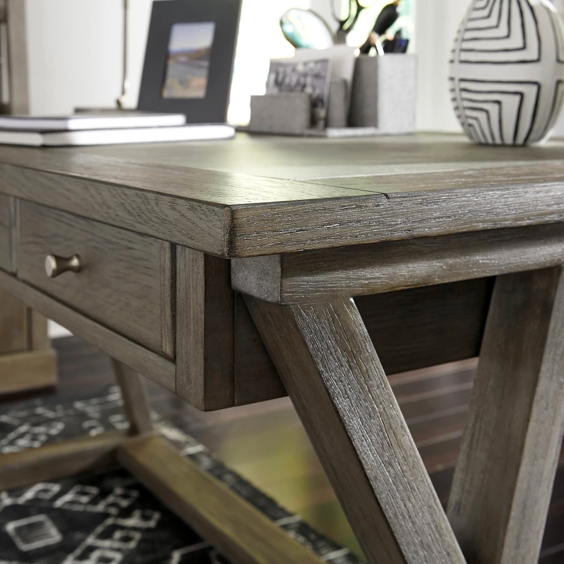 Work the latest trend in casual farmhouse living with the Ashley Luxenford home office desk. Elements include distinctive cross brace with stretcher styling and a wire brushed finish. This home office desk is extra unique because it features a faux bluestone inset on the desktop for a mixed media twist. Three smooth-gliding drawers with brushed nickel-tone pulls help keep you organized and on task. Made with select hardwood solids and White Oak veneer in a wire brushed finish. Model: H741-44.