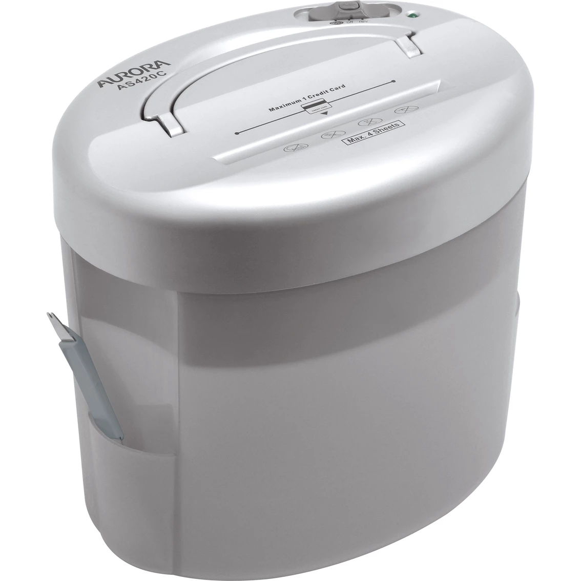 Designed for economical document security, this light duty desktop paper shredder is ideal for occasional home/office use. Durable steel cutters destroys documents into 1/5 in. x 1 17/20 in. pieces, shredding up to four sheets of paper or one credit card per pass. The AS420C includes an integrated 1.32-gallon translucent gray wastebasket and matching letter opener accessory. Recessed collapsible handle allows easy removal of shredder head to empty wastebasket.