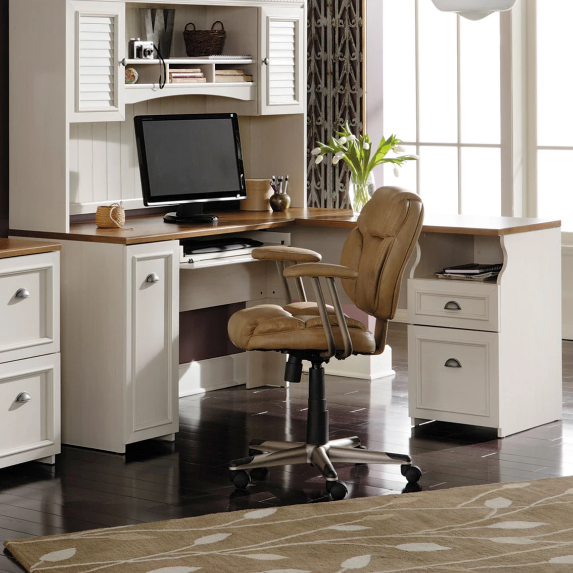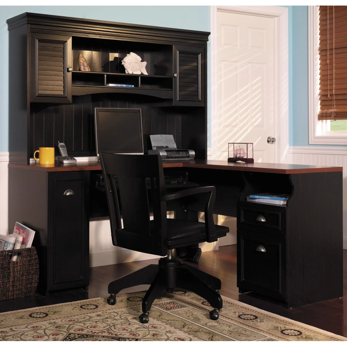 The Bush Furniture Fairview L Shaped Desk brings traditional style with modern functionality. Engineered wood with laminate materials. Antique finish with tea maple-tone tops. Space-saving design. Concealed CPU compartment and box drawer for miscellaneous supplies. One letter-size file drawer. Pencil drawer with drop-down front can also be used as a keyboard shelf. Desk only; hutch not included. Model: WC53230-03K.