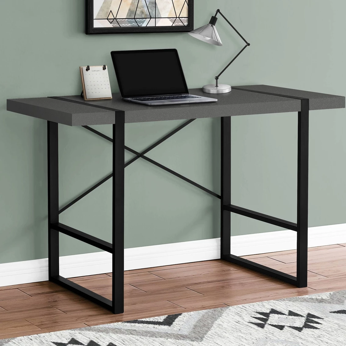 This stylish industrial-inspired 48 in. Computer Desk from Chelsea Home could easily pass for an accent table. It features a spacious, thick-panel laminated desktop and sturdy metal legs in a contrasting black finish. The metallic components are put on full display with rectangular legs integrated into the desktop and an exposed support bar in an attractive X shape on the back of the desk. If you use a living room or bedroom as a home office and are looking for a streamlined alternative to traditional desks, this laptop or writing table gets the job done. Model: 95I7659-D-T.