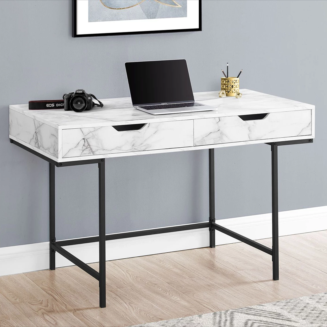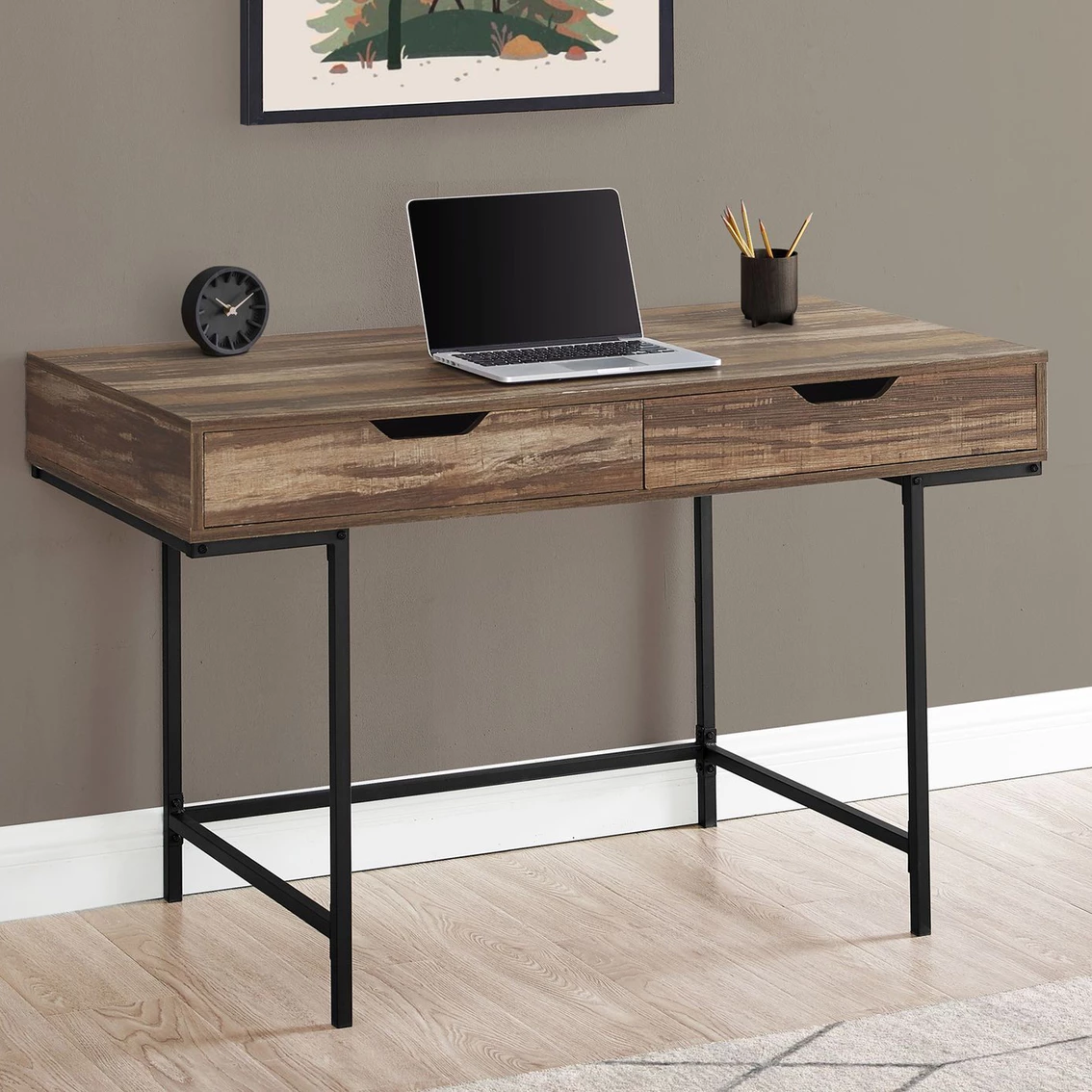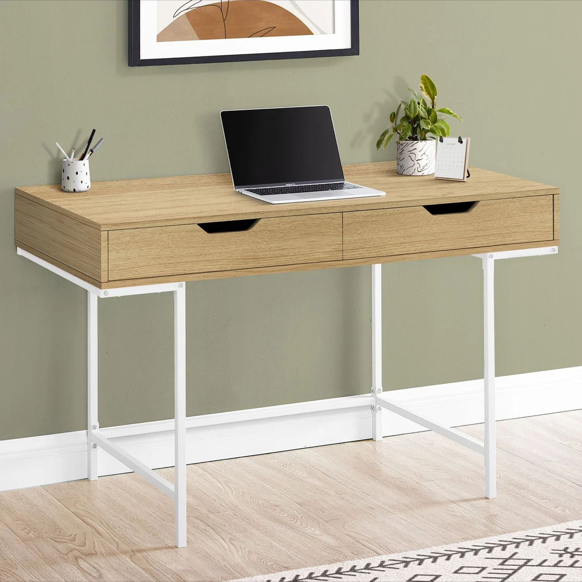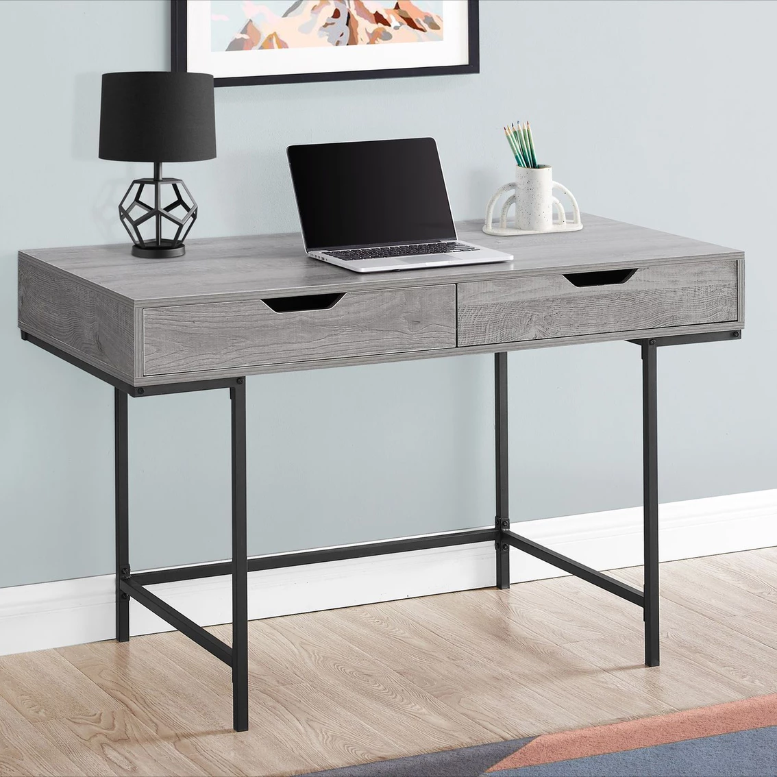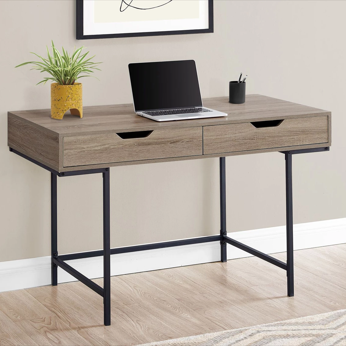 A stylish study in contrasts, this streamlined Chelsea Home Furniture Computer Desk will add style to any room. This desktop has a substantial appearance thanks to an ample work surface and built-in drawers. The two storage drawers are wide and deep, offering room for supplies like writing materials and even letter- and legal-size papers. Supporting the top is a sturdy base in a black finish with slender metal legs that are recessed for a striking look. With its clean design and compact size, this modern laptop desk is ideal for smaller home offices and is attractive enough to also serve as an accent table. Model: 95I7552-CD.