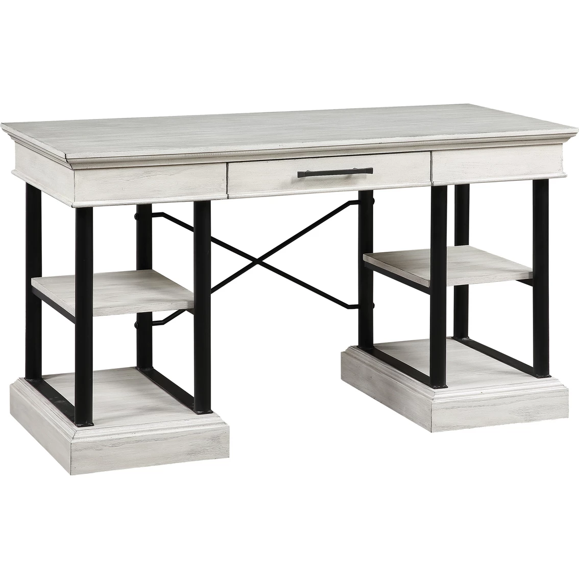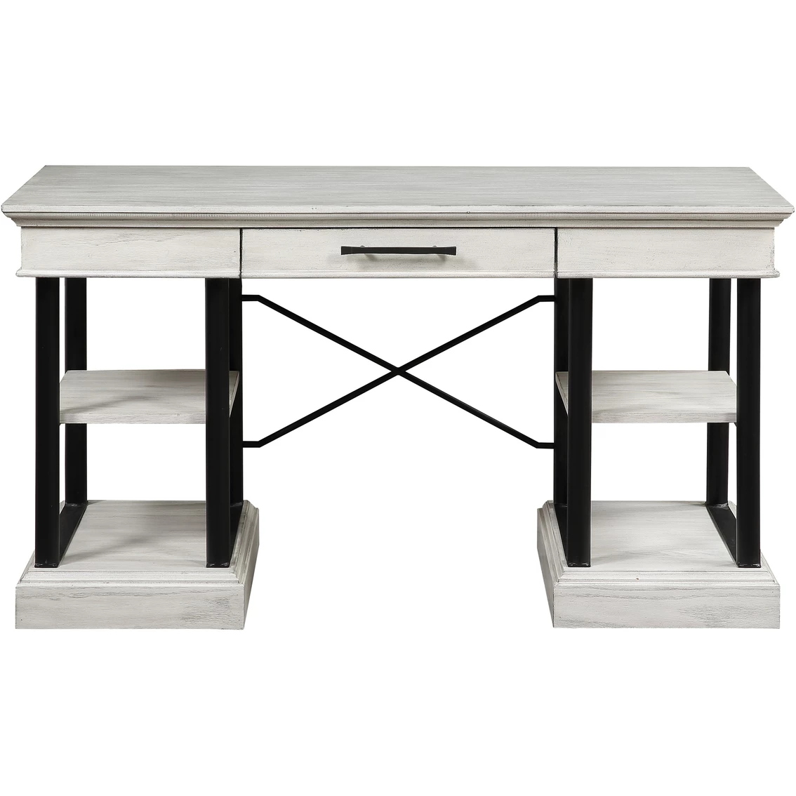 An impressive and bold design, this striking Gabby 1- Drawer Desk from Coast to Coast Accents has everything you have been looking for and more. Double dark metal legs rise up from the tiered bases on either side, nestling open shelves and supporting the spacious top, all of which are finished in Gabby Hazy White for a beautiful contrast. For your home office, den or anywhere in between, this desk will be a standout as well as a wonderful place from which to work. Model: 51541.