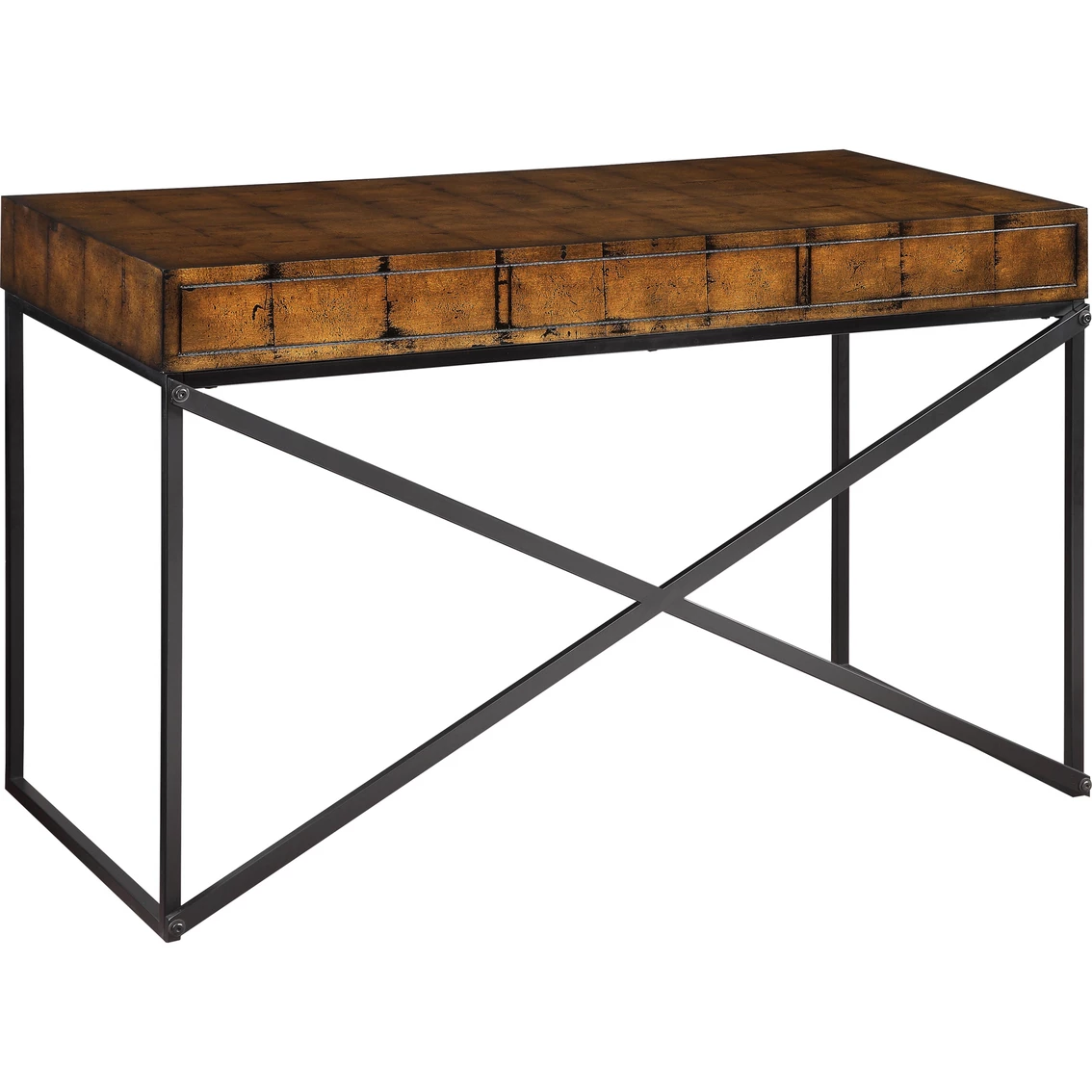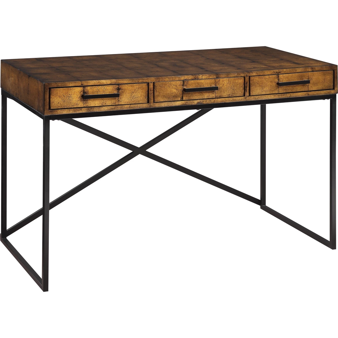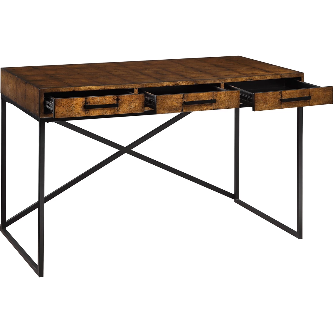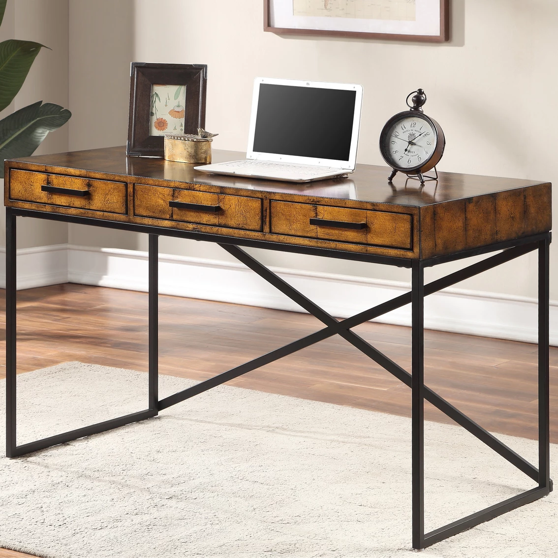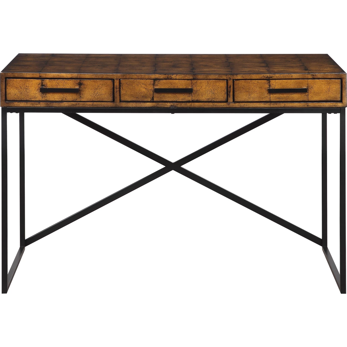 Finished all the way around, this handsome Three Drawer Writing Desk from Coast to Coast Accents can go anywhere in your home with ease. Gleaming in a rich Tabitha Aged Gold finish, the subtly patterned wood grained top floats above the open black powder coated metal base. With three spacious drawers for your papers, pens and laptop, this desk has all the space you need in a style that so perfectly fits into your decor! Model: 55641.