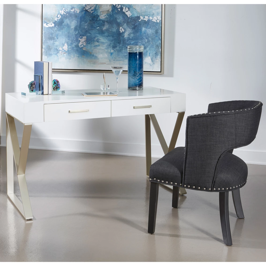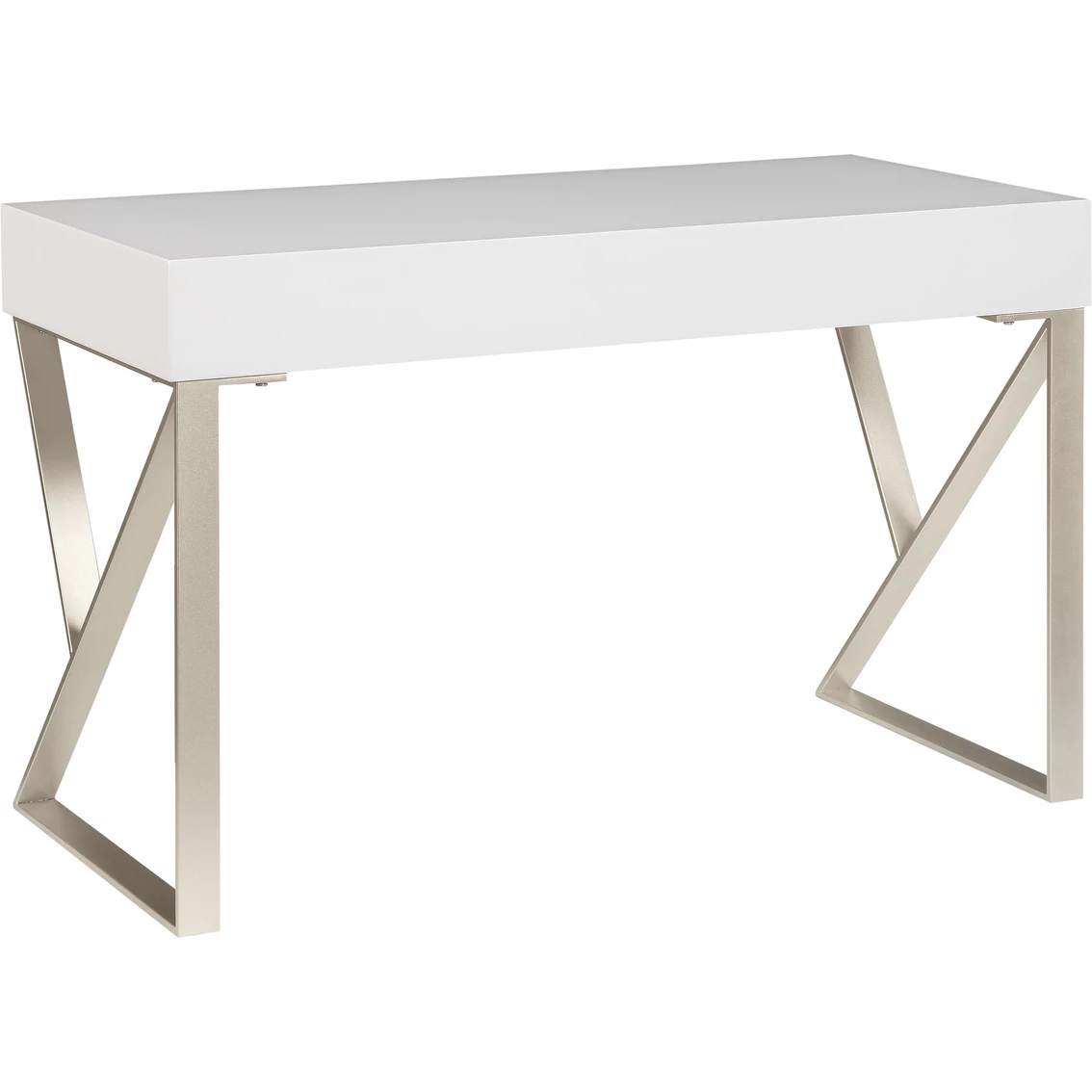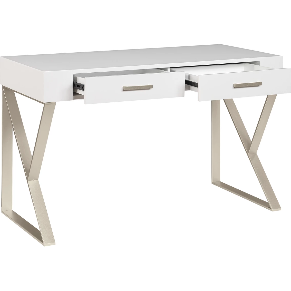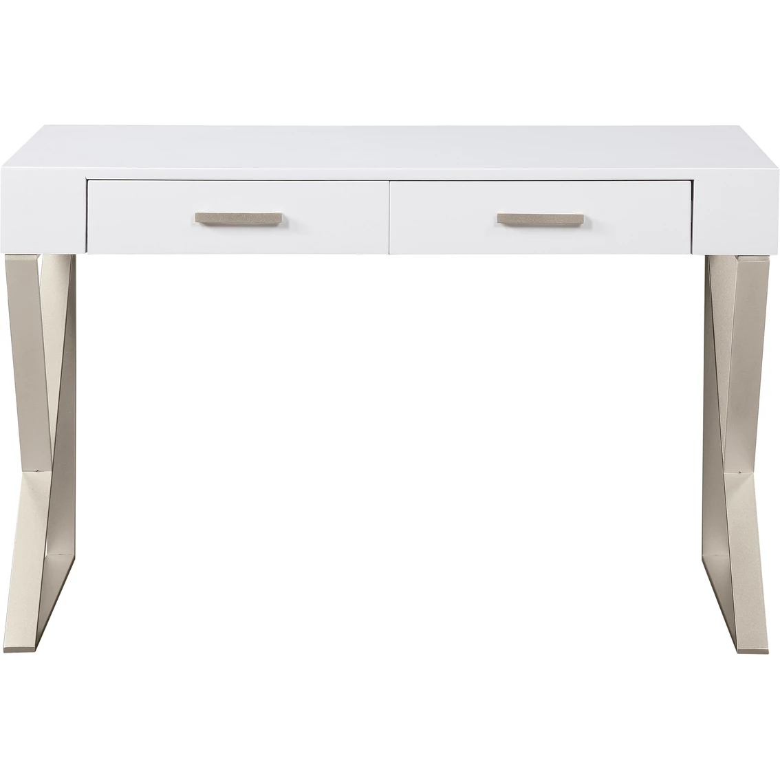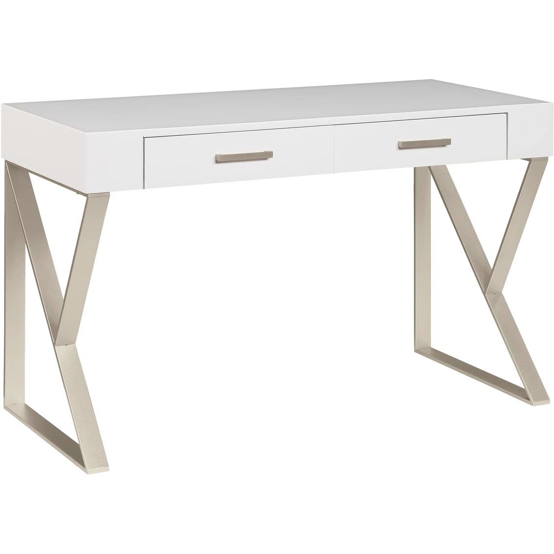 The clean lines of this Two Drawer Writing Desk from Coast to Coast Accents has that modern flair, with angled silvery metal legs holding aloft the spacious top, all finished in a scrumptious Dreamy White and Champagne Lights for a fresh open appearance. Matching hardware adorn the two drawers, where you have an abundance of storage for your laptop and writing supplies. Perfect for your home office or kitchen, or even for in your playroom for puzzles and games! Fun! Assembly required. Model: 55643.