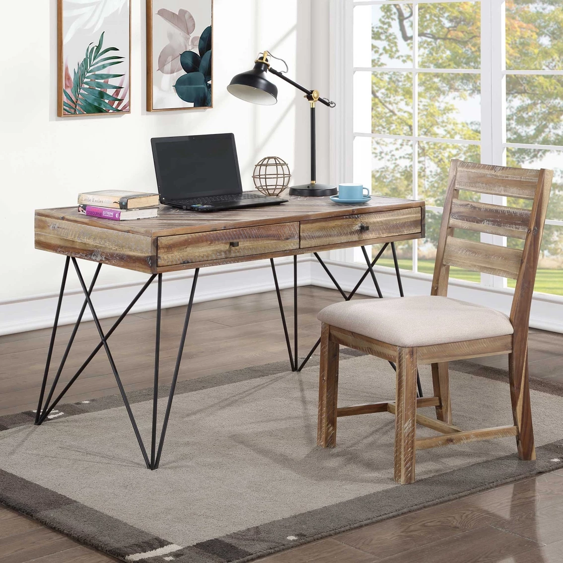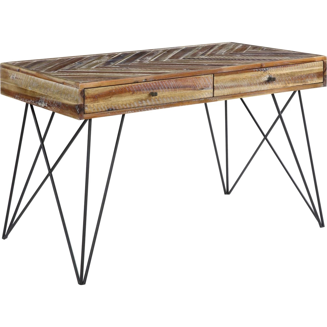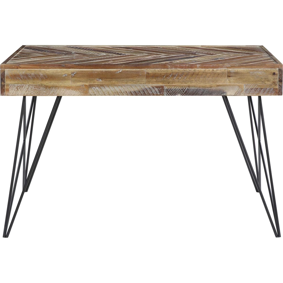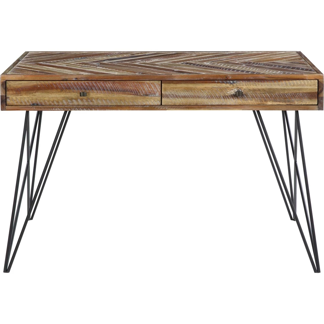 Sometimes everything just comes together perfectly to create exactly the look that speaks to you and your casual lifestyle, and the two drawer Vail Writing Desk from Coast to Coast Accents is the perfectly example of this! Naturally finished in Vail Natural Brown to bring out the warm wood tones and highlight the beautiful pieced chevron pattern on the top, and perfectly accented with thin dark metal hairpin legs, this Desk will keep your look light and airy, and be a pleasant addition to any room! Model: 55676.