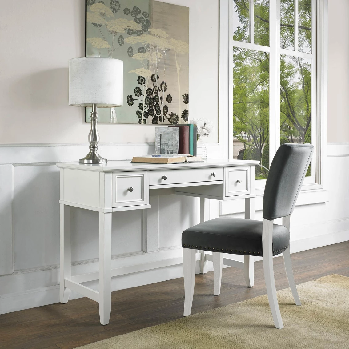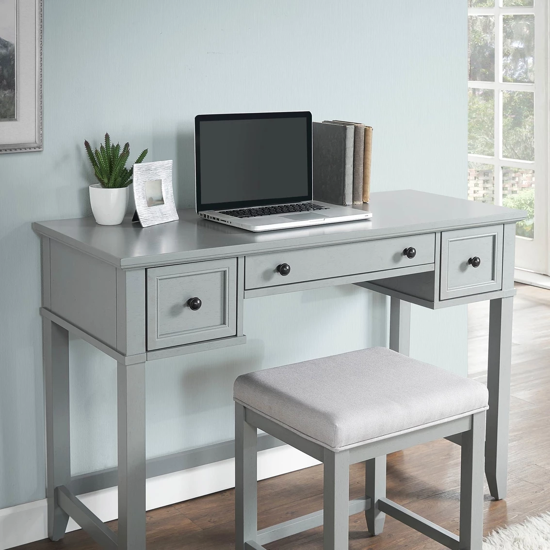 Simple and traditional, the classic silhouette of the Vista collection complements any decor. Sit at the expansive countertop, which is useful as a desk or makeup vanity. The three easy-gliding drawers provide ample storage.