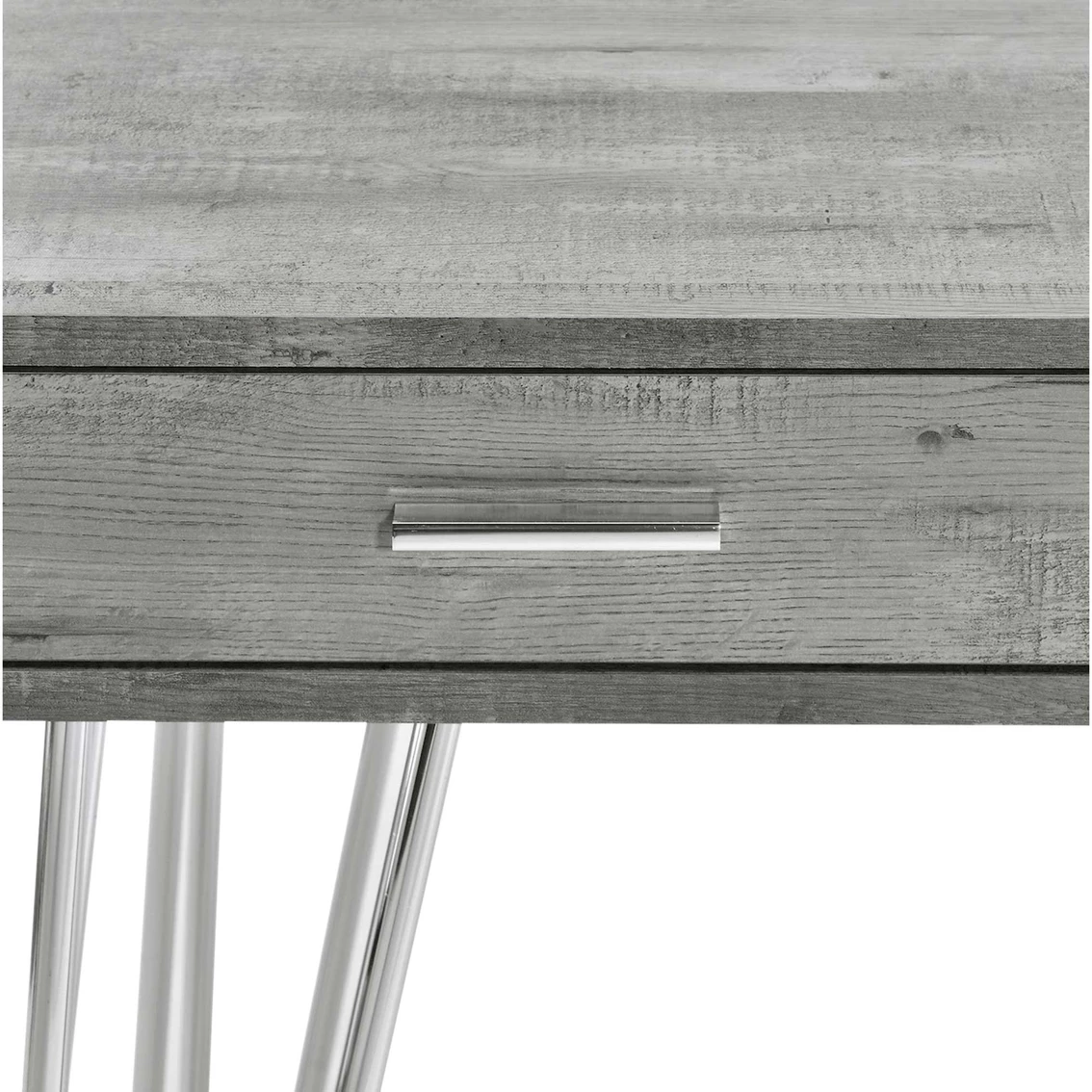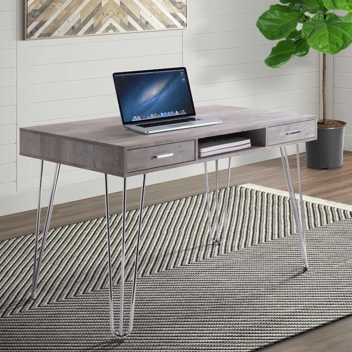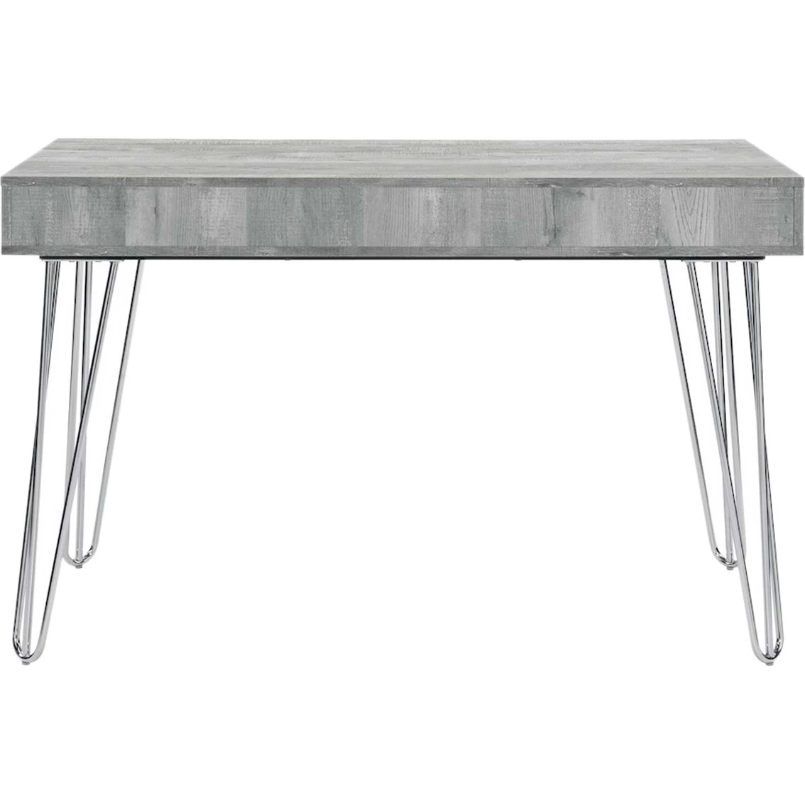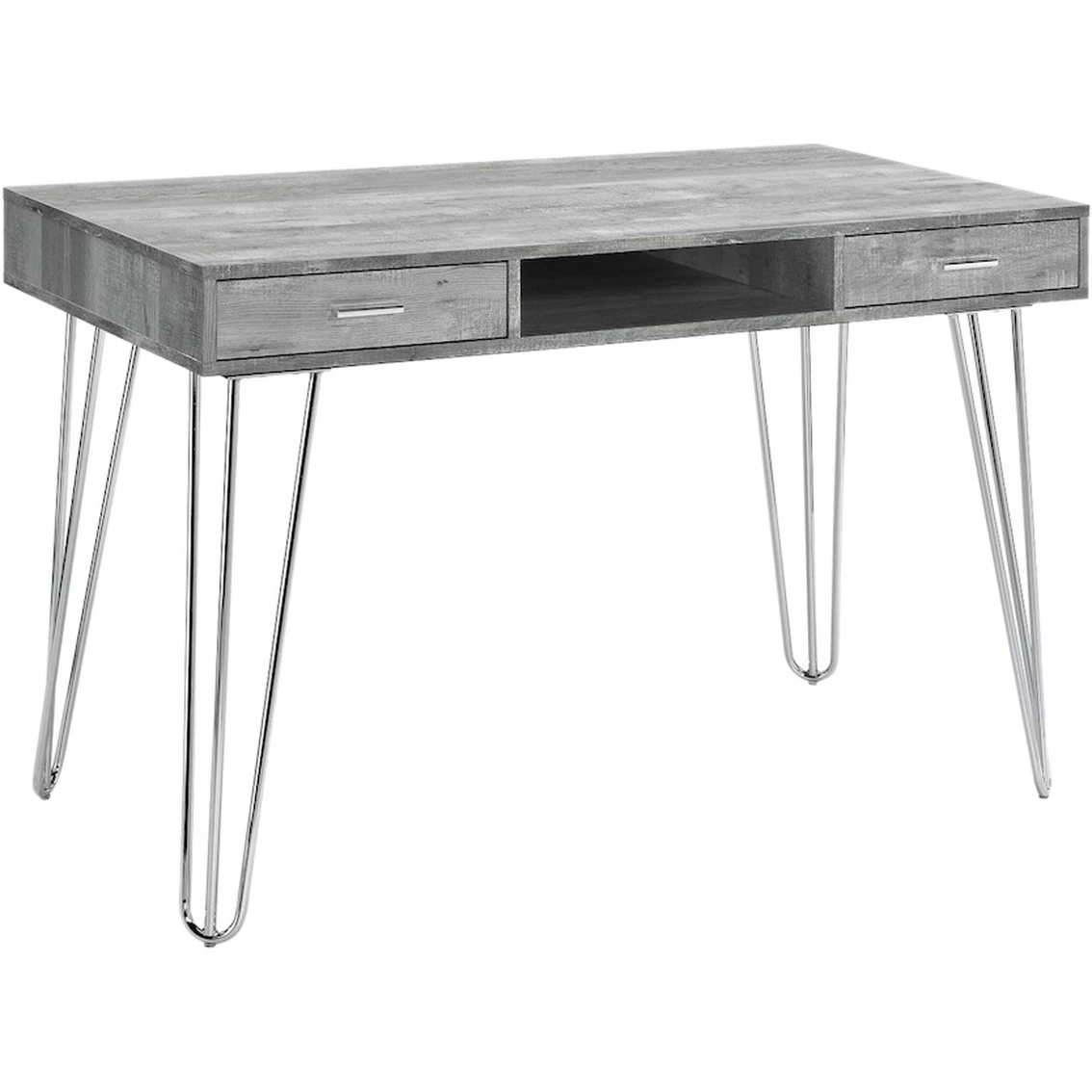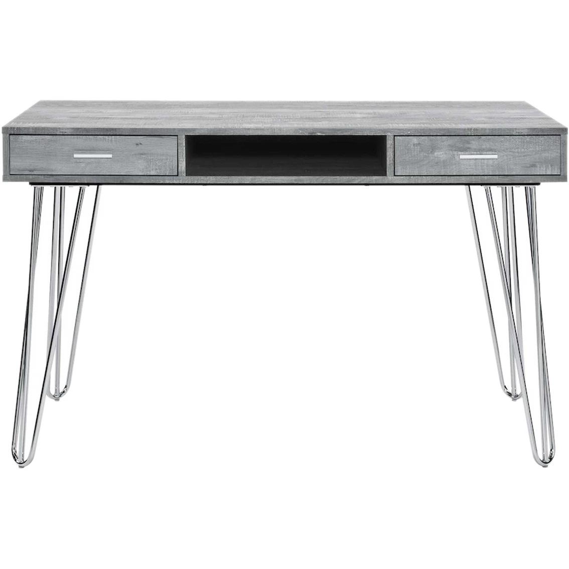 The Kapono Desk by Elements will be a stand-out in your home office space. Mid-century inspired with a industrial edge. Crafted from particle board and paper with a neutral grey finish. Distressed detailing throughout desk creates rustic appeal and character. Built in open storage space underneath desk and two drawers for keeping your supplies in reach. Model: A.10130.DKE.