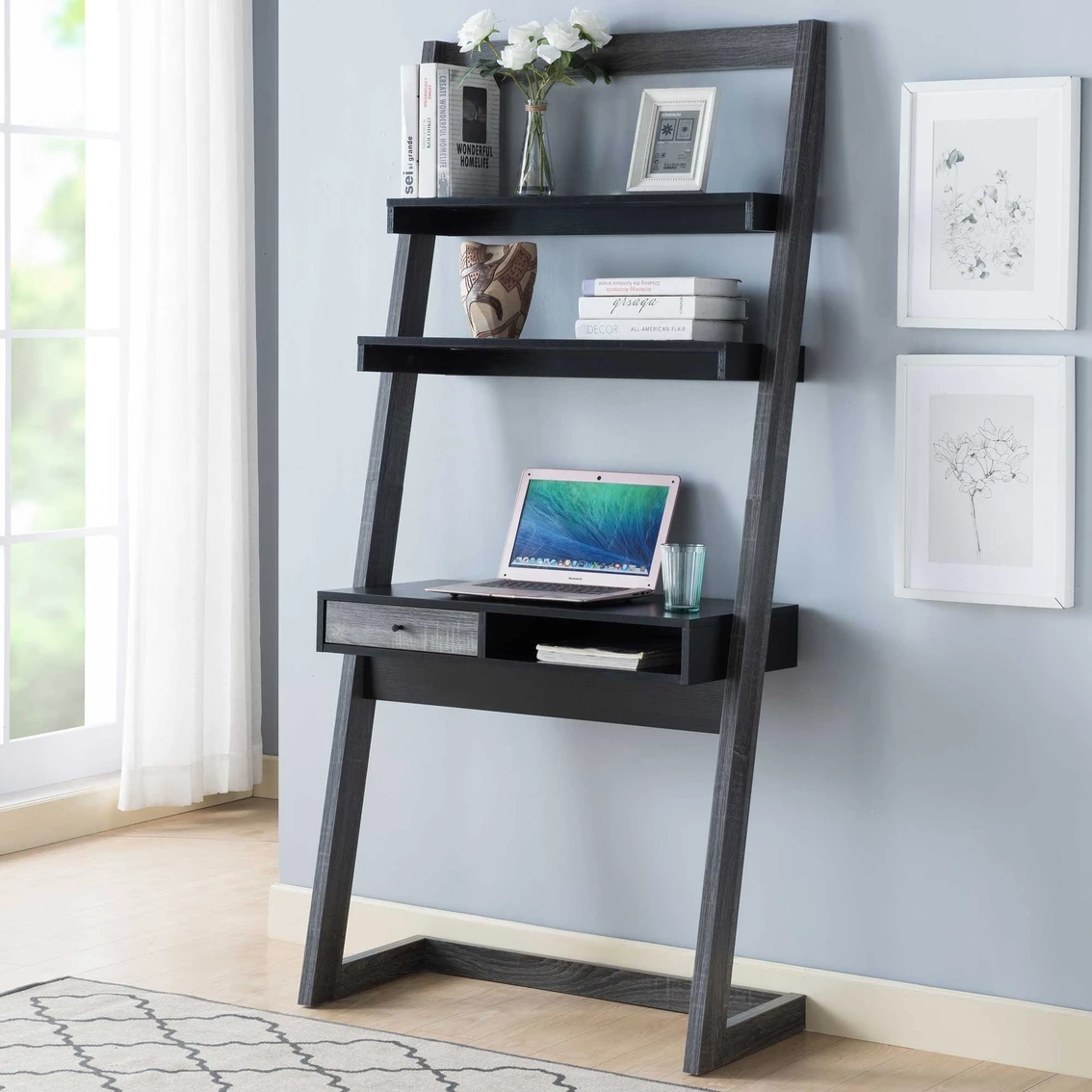 Delivering the minimalist, contemporary style you love, this black and distressed gray wood ladder desk establishes a productive workspace in your bedroom or living area. The Furniture of America Mani Wall Unit boasts a dimensional finish over MDF and particle board construction for durability. The desk shows off a cool ladder silhouette, with an angled frame and two upper shelves perfect for showing off framed pictures and organizing desk supplies. The compact desktop is ideal for writing or working on a laptop and the space underneath is optimized with one drawer and one cubby-style shelf. Some Assembly Required (Tools Not Included). Model: IDI-202749.