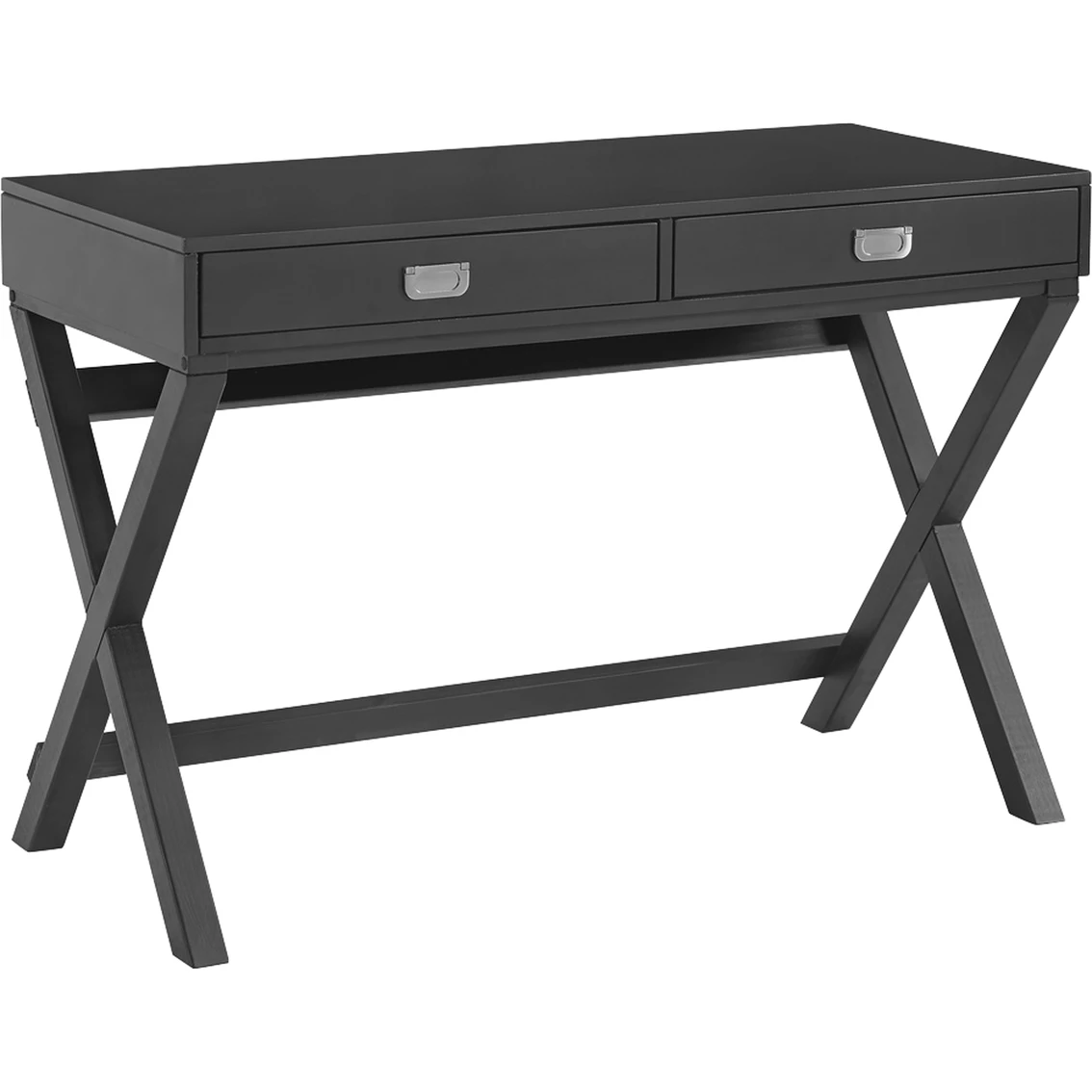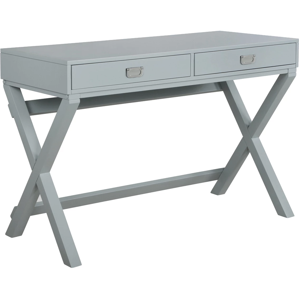 Make work fun with this campaign style Linon Peggy 2 Drawer Writing Desk. Finished in stunning hardware, this multifunctional piece adds a pop of color and organization to any office or work area. It features two drawers with metal glides, providing great storage for supplies. The X-frame, wooden legs create a sturdy foundation with a distinctly modern look. At 44 in. wide, its smooth top offers generous space for your computer, a lamp and more. Model: PG153BLU01U.