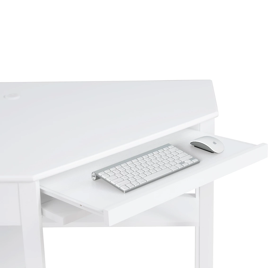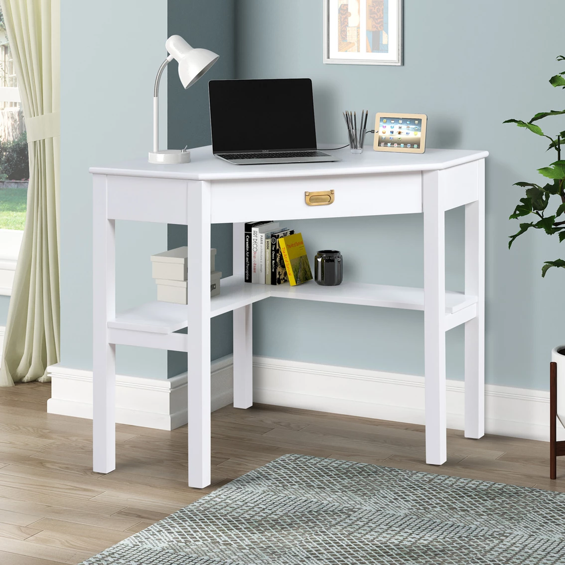 This campaign-style Linon Peggy Corner Desk is the perfect option for any home, office or dorm room. The simple design and x-frame legs will save you space, while still providing plenty of room for your books, laptop, tablet or mail. The lift-top provides tons of additional storage space for things you’d like to keep tucked away. The smooth white finish will complement any decor color scheme. Model: PG154WHT01U.