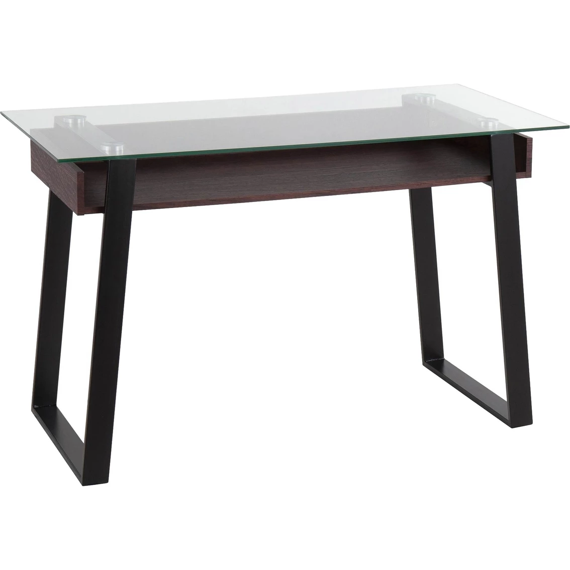 Tackle your daily home office tasks in style with the sleek design of the Duke Desk by LumiSource. This stylish walnut finished wood desk features rectangular black metal legs, an expansive tempered clear glass work surface and a generously sized see-through cubby, perfect for all of your supplies.