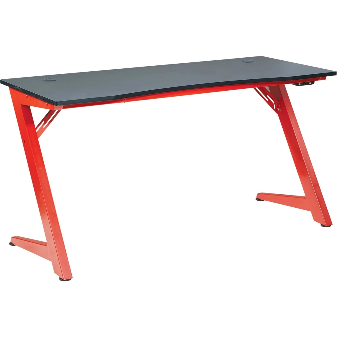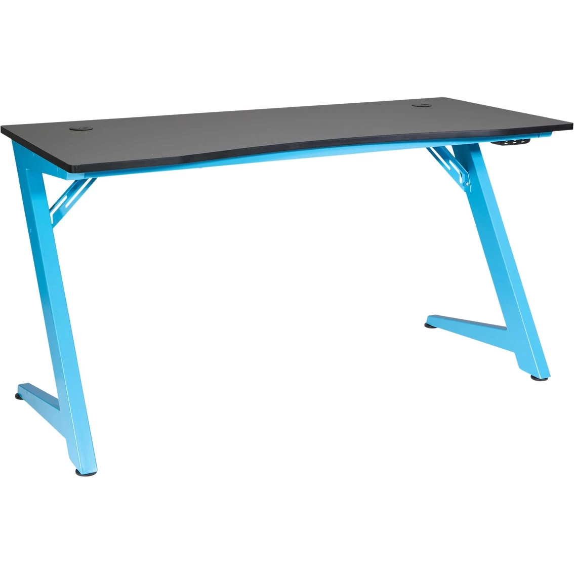 Level up your game setup. The BETA Gaming Desk from OSP Home Furnishings offers the competitive platform your high-octane gaming demands. Large surface provides ideal space for monitor and gaming accessories. Customize the location of your power-up preferences with our magnetic 3-port smart power USB hub. Enjoy total game immersion with Bluetooth controlled RGB LED lights that let you set the mood. Our power strip bracket and cable management system offers a seamless transition from gaming to workstation making this your perfect media hub. Compelling Z frame design and sturdy steel construction in exciting red, blue and stealth black with matte black game surface will provide years of competitive enjoyment. Model: BET25-BLU.