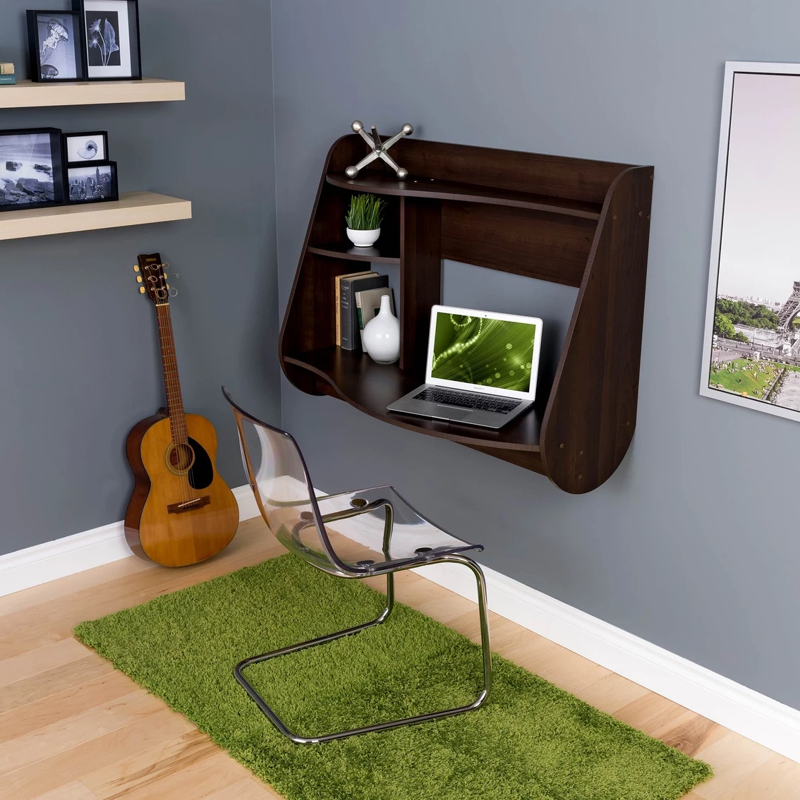 Soft contours and modern lines complement each other in the Kurv Floating Desk from Prepac, making it a space-saving statement that will stand out in any room. The lightweight design makes assembly and installation a breeze. Kurv hangs directly on your wall with Prepac’s innovative cleat system, saving you valuable floor space. The spacious side compartments are just the right size for your important binders, books or anything else you may need close at hand, with removable shelves to store taller items.