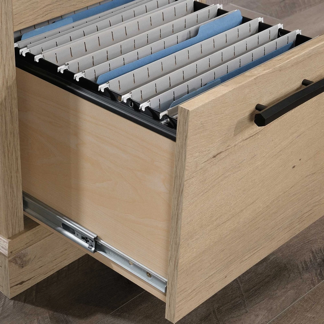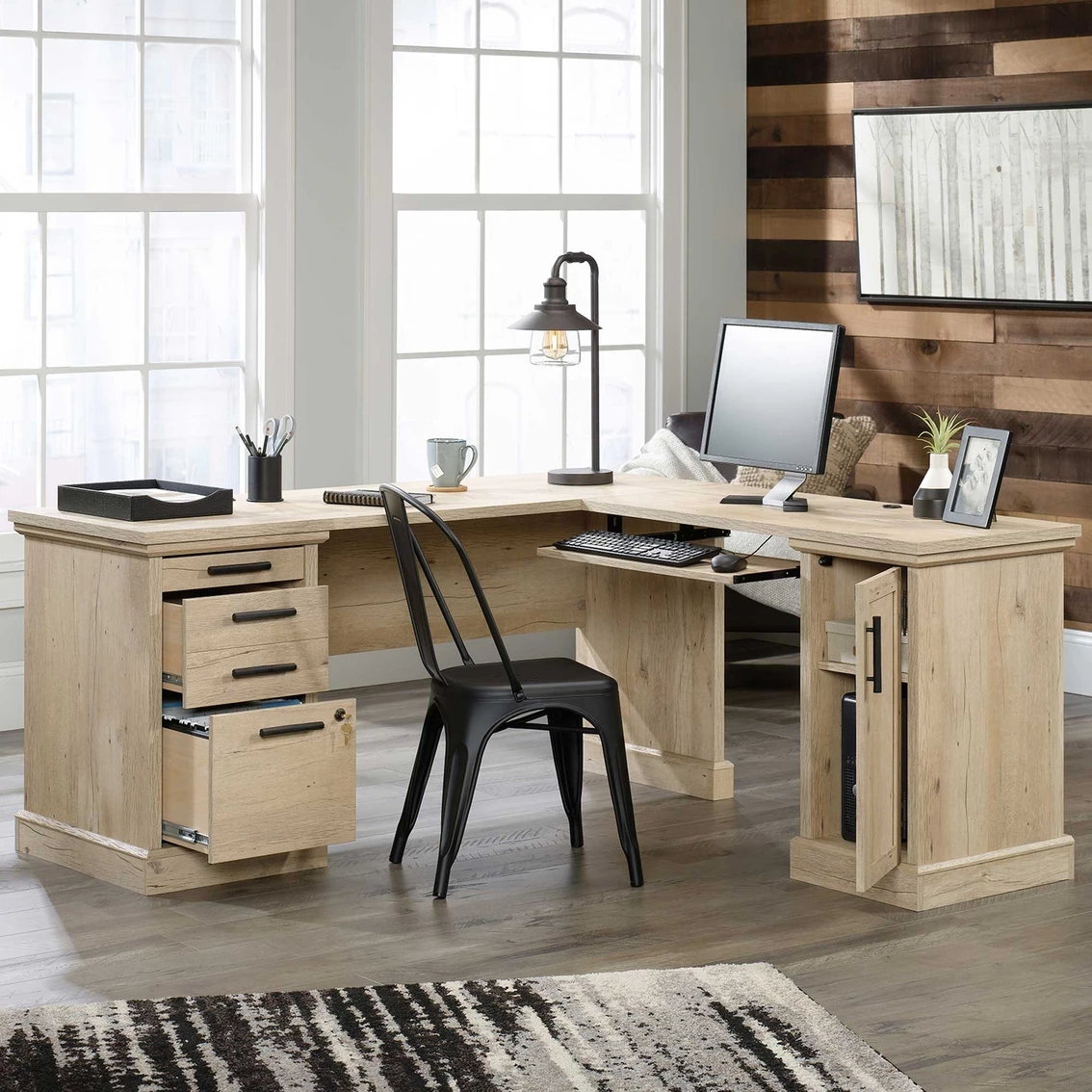 We desire a lot from a home office desk. Thankfully, the L-Shaped Desk from the Sauder Aspen Post collection offers what you need – and tons more! This home office desk features a slide out shelf for your keyboard and mouse which keeps the top surface free to display photos of your family, to do lists, and your favorite pens. The under desk keyboard shelf features metal runners and safety stops that can be fastened in three different positions. Storage is not a problem with this L-shaped computer desk as it features three drawers with full extension slides. The lower drawer of this office desk with storage holds letter or legal size hanging files and includes a lock for security to keep your documents organized and easy to find. There is room for additional storage with an adjustable shelf and a vertical CPU tower behind the door. Your cords will never be unorganized again with the desktop grommets that this home office desk offers. If cords aren’t your thing, this desk accommodates optional Hidden Wireless Qi Charger by Eggtronics 425905 (sold separately β visit sauder.com for more information). To get you settled into your new desk as quick as possible, this item features quick and easy assembly with patented T-lock drawer system. This item is finished on all sides, so it can look good however you arrange it in your home! Finished in Prime Oak, this multifunctional L-shaped desk checks every box you could think of. And it looks great while doing it. Assembly required. Model: 427163.