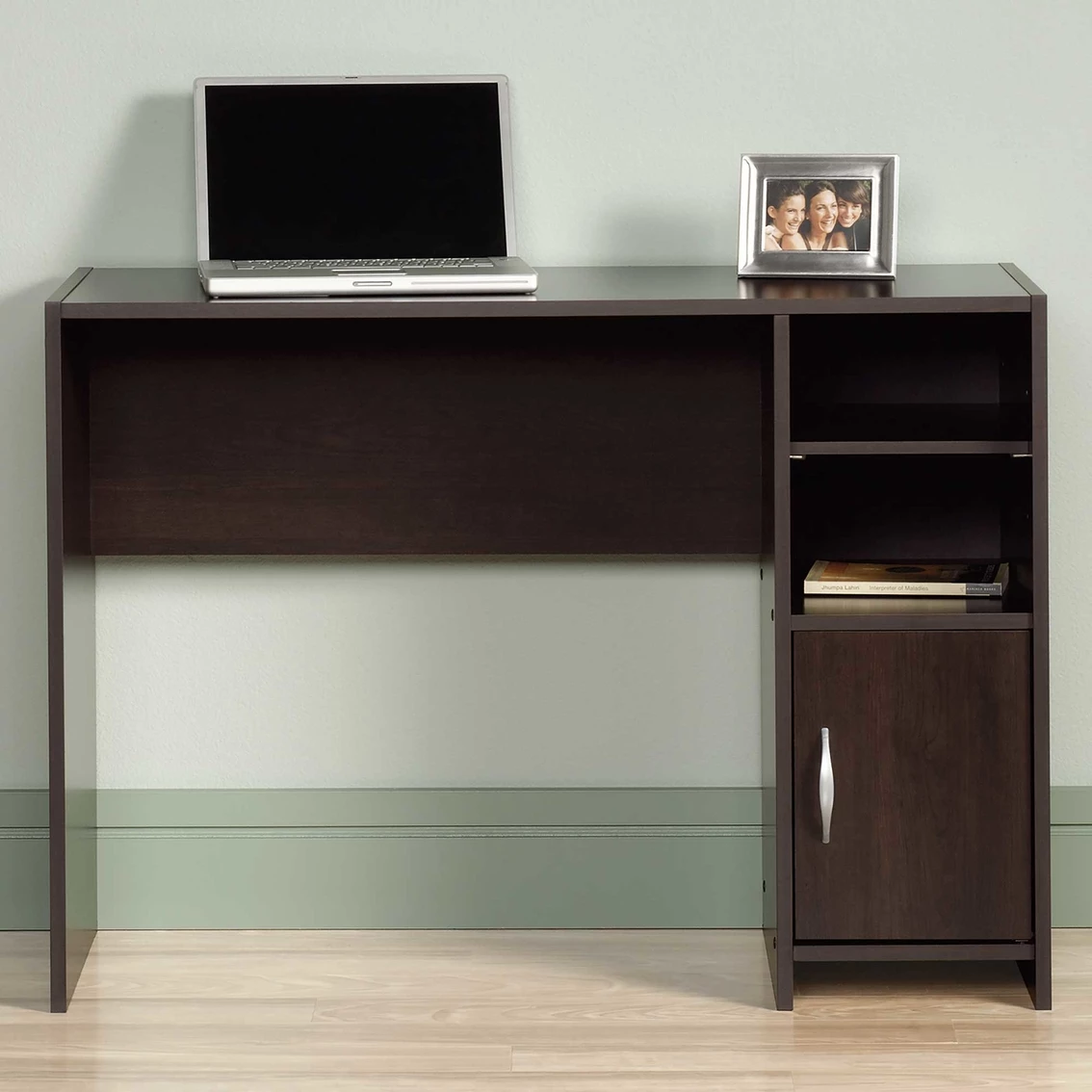Redefine your workspace with the clean and simple design of this desk from the Beginnings collection. Its large tabletop surface provides you with a spacious workspace and room for all your must have office essentials – laptop, collection of notebooks, photos of your family and of course your favorite coffee mug. This good-looking office desk features open cubbyhole storage that includes an adjustable shelf for easy access storage of any miscellaneous office supplies. Behind the door is a hidden storage area for all your additional storage needs. Finished in a classic Cinnamon Cherry and accented with silver hardware, this stylish computer desk will give your office a fresh new look and will have you motivated and ready to work. Model: 415817.