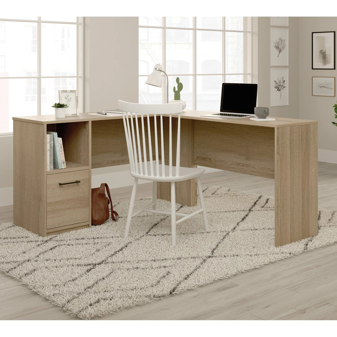 It’s time to take care of business! Find the motivation you need to tackle all your projects when you add the beautiful style and increased functionality of this L-shaped desk from the Sauder Beginnings collection. This home office desk offers a spacious top surface that provides you with all the room you need for desk essentials like your laptop, stacks of folders, notepads and your hot cup of coffee. There’s also plenty of space for home decor items like an accent lamp and framed photos. The lower file drawer with full extension slides can hold letter-size hanging files so you can keep all your important documents organized. The open shelf cubbyhole provides you with additional storage space for miscellaneous office supplies like envelopes and your stapler. This desk is finished on all sides for versatile placement throughout your home. Finished in Summer Oak, this L-shaped will have you feeling ready to work!