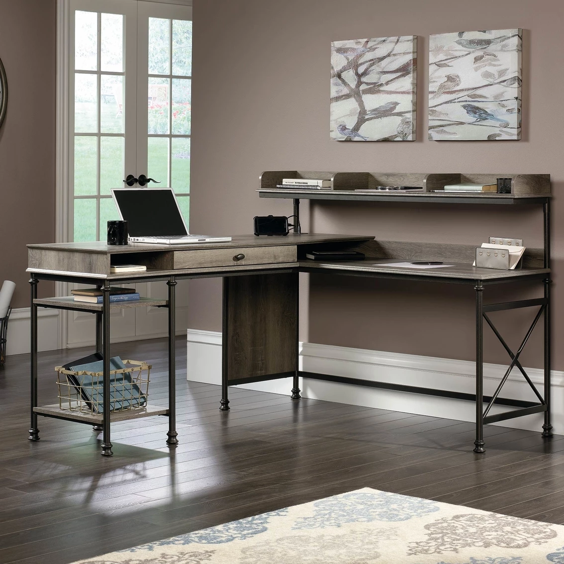 Maximize your office capabilities with this industrial inspired L-shaped desk from the Sauder Canal Street collection. Its large tabletop provides you with plenty of space for your laptop, tablet and papers, plus a little extra elbowroom. It features built-in USB ports for easy charging, grommet holes for cord management, a pencil drawer with full extension slides, and elevated shelving. Finished on all sides in Northern Oak with a decorative, powder-coated metal frame, this beautiful L-shaped desk will add style and class to your office space.