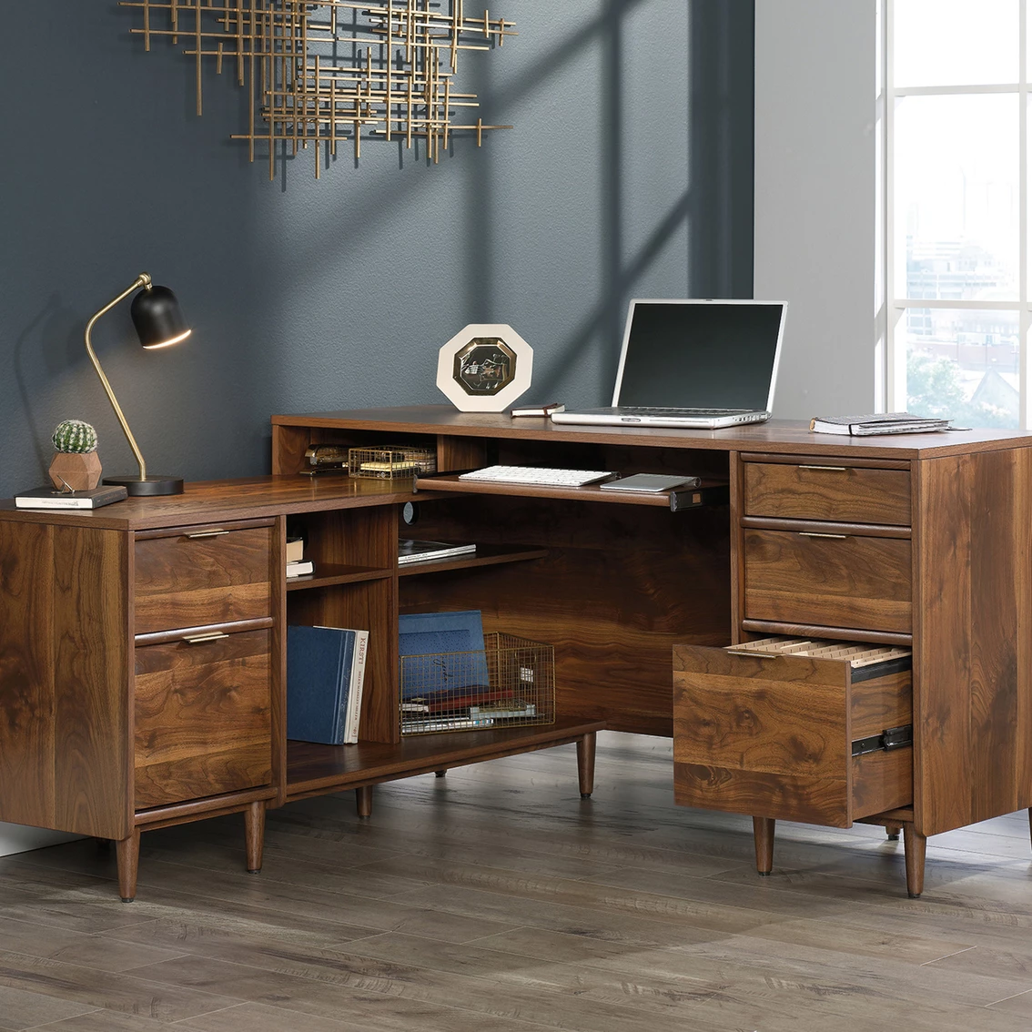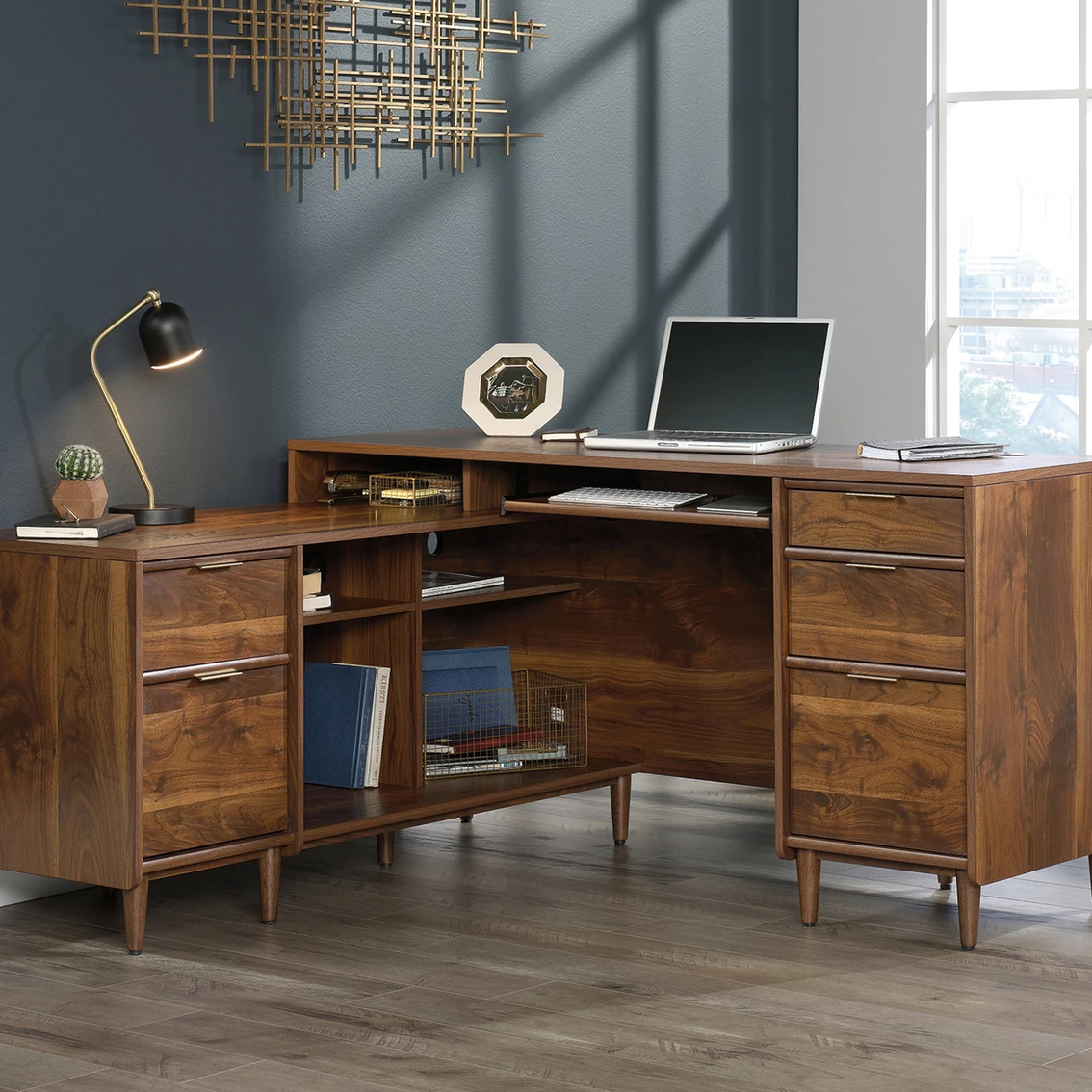 Enhance your home office or workspace with this L-shaped desk from the Sauder Clifford Place collection. Never run out of workspace — this mid-century inspired desk provides you with an abundance of tabletop space for all your office essentials like your laptop, important papers, notepads and much more! It features a slide-out keyboard/mouse shelf that opens and closes on smooth metal runners. Storage is no issue with this desk! It includes three easy gliding storage drawers and two file drawers with full extension slides that accommodate letter-size hanging files. It also features cubbyhole storage for easy access storage of books, bins and folders. Its grommet holes and pass-throughs allow you to keep all your cords and wires neat and out of the way. The return can be fastened on to the left or right side to fit the needs of any room in your home. Finished on all sides in a warm Grand Walnut and accented with solid wood feet and bold brass hardware, this handsome desk will take your office space to a whole new level. Model: 421120.