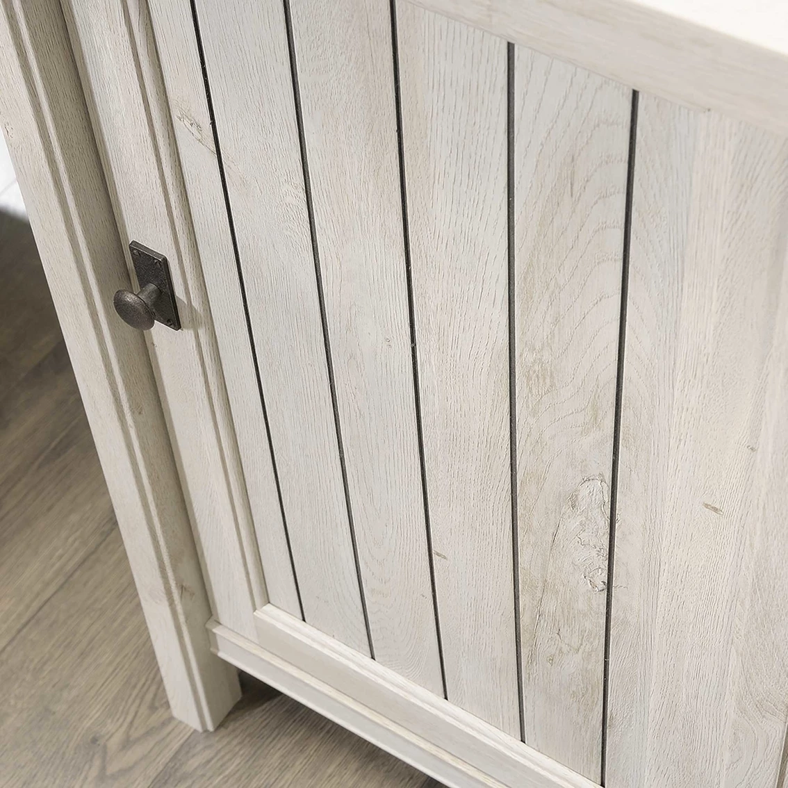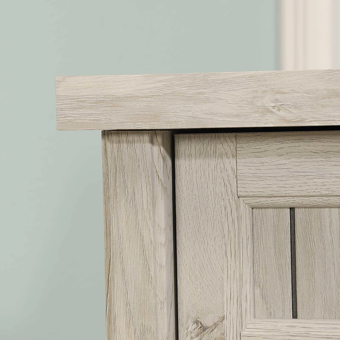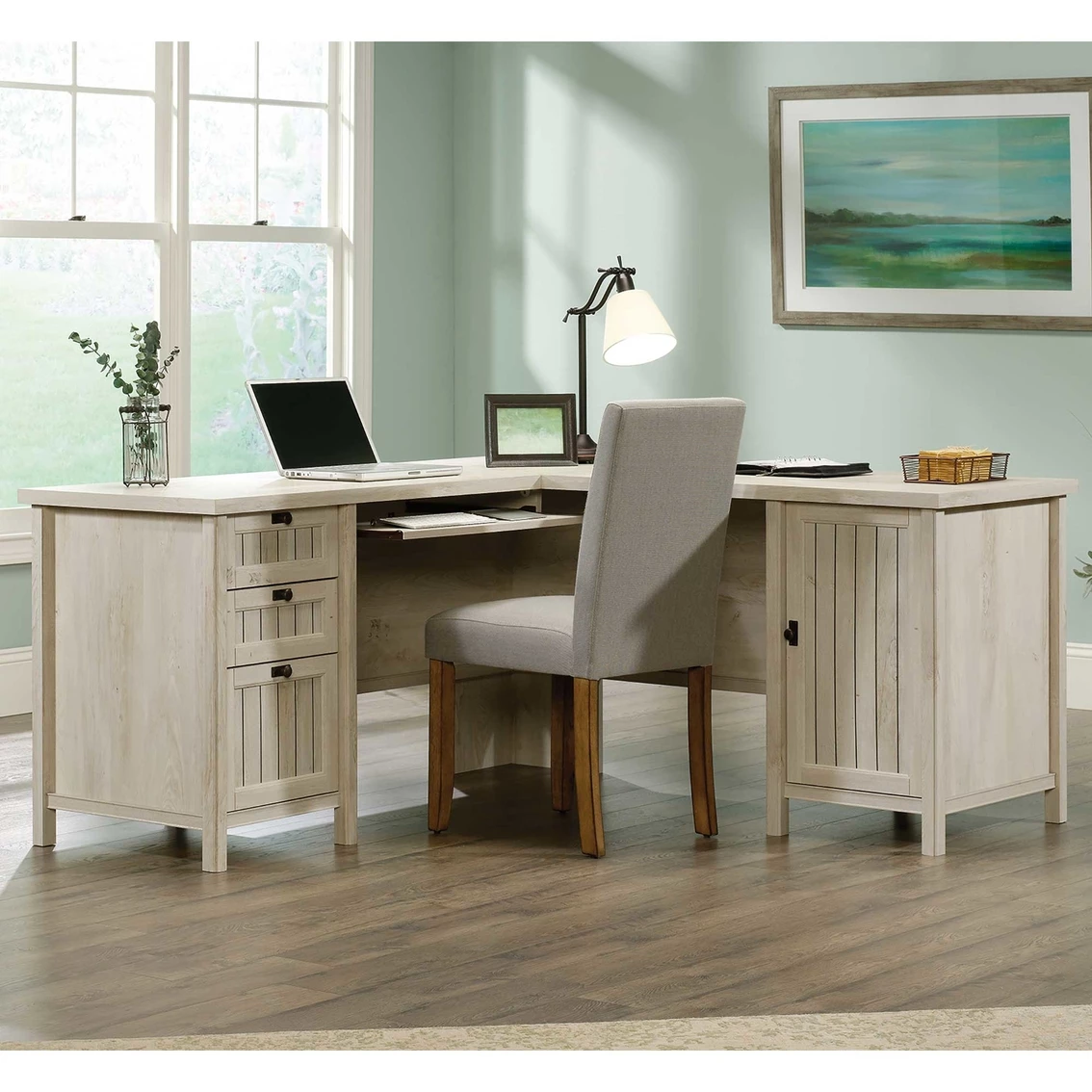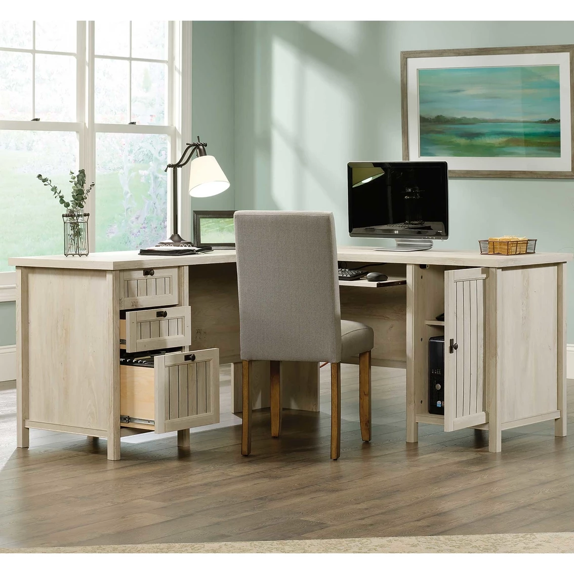 Take your home office on an island-inspired getaway with this L-shaped desk from the Sauder Costa collection. This beautiful desk offers a spacious tabletop surface that provides you with room for all your must-have office essentials — laptop, collection of notepads, desk lamp and your favorite coffee mug. It features a slide-out keyboard/mouse shelf that opens and closes on smooth metal runners. It also features two easy gliding storage drawers along with a lower file drawer with full extension slides to hold letter or legal size hanging files — talk about organization! Behind its framed door is an additional hidden storage area that includes an adjustable shelf and can also accommodate a vertical CPU tower. Each drawer and door front is framed and detailed with a slat-front to give it that costal vibe. Other features include a desktop grommet hole for cord and wire access. Finished on all sides in Chalked Chestnut, this eye pleasing desk will give your office a fresh new look.