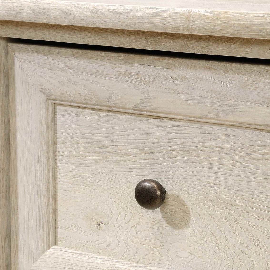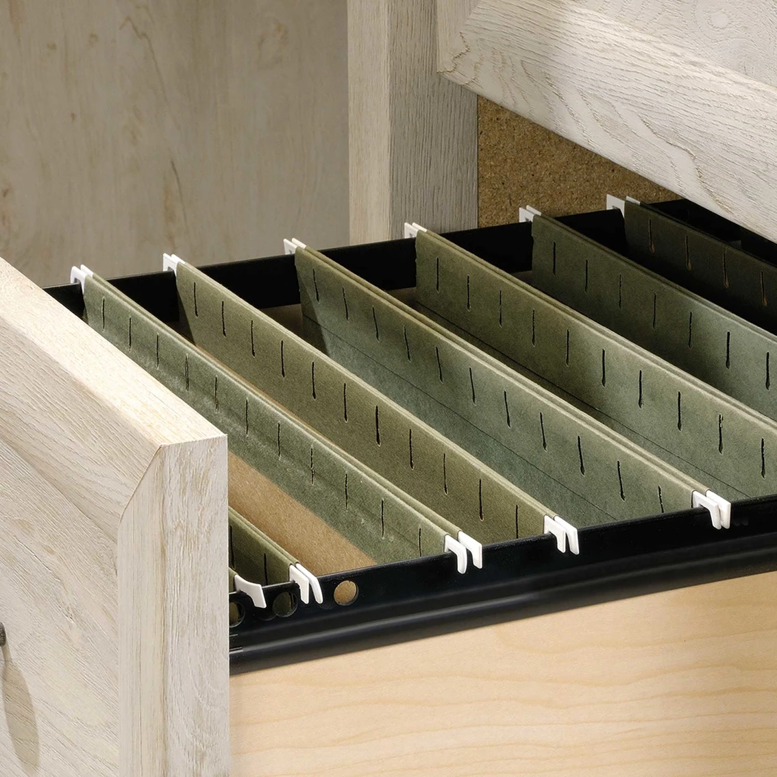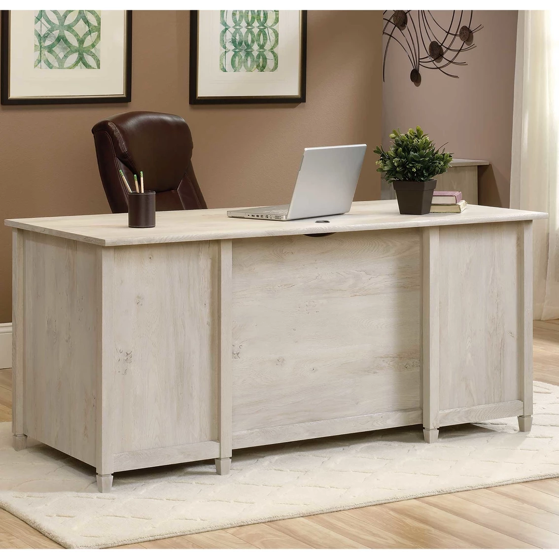 Beautify your home office or work space with the charming style and simplistic design of this executive desk from the Sauder Edge Water collection. Its spacious desk top surface provides you with ample room for all your must-have desk essentials ranging from your laptop and cup of coffee to your collection of notepads and an accent lamp. It features a large drawer/shelf with a flip-down panel for your keyboard/mouse. It also includes two small drawers that open and close on smooth metal runners for easy access storage of miscellaneous office supplies like pens, stamps and staples. The two lower file drawers with full extension slides hold letter size hanging files so you can keep important documents organized. Its desk top includes a grommet hole for cord access so you can keep all your wires neat and out of the way. Finished in Chalked Chestnut, this stunning executive desk will have your office looking top notch. Model: 418795.