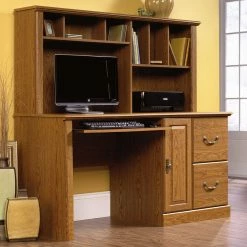 Whether you’re at work or home, work in style with this desk from Sauder’s Orchard Hills collection. It features a slide-out keyboard/mouse shelf, storage behind the panel door for a CPU tower and two drawers that can hold letter, legal or European size hanging files. All slide-outs and drawers open and close on smooth metal runners with safety stops. Find even more space for office essentials in the cubbyhole and vertical storage compartments of the hutch. With its Carolina Oak finish, this desk will dazzle while you’re getting the job done.