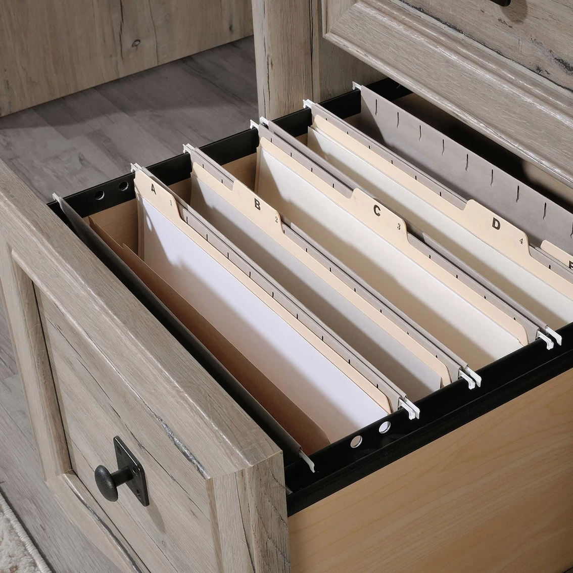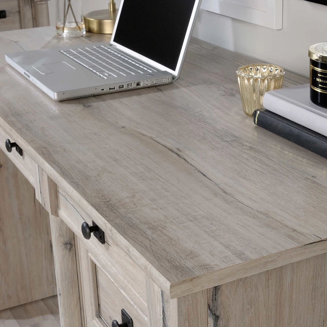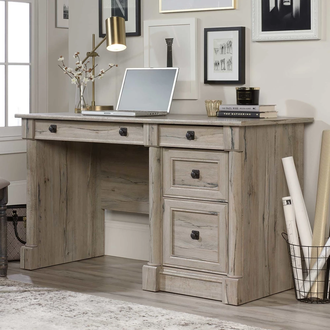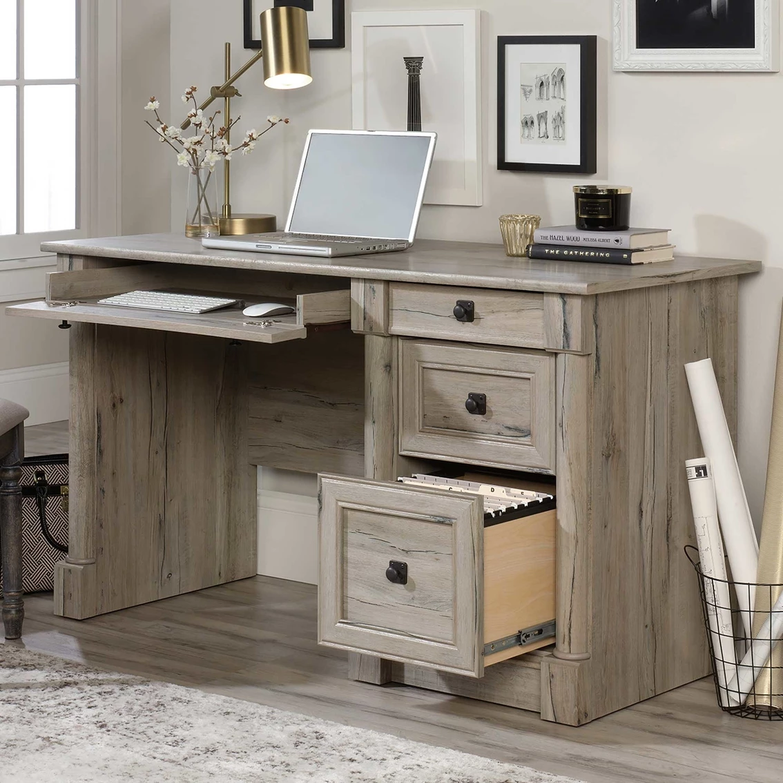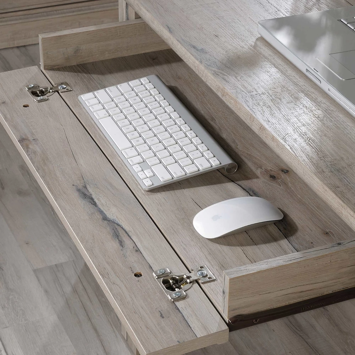 Your home workspace should be just as stylish as the rest of your home. Give your home office the upgrade it deserves with the beautiful style of this computer desk from the Sauder Palladia collection. This small office desk offers a spacious top surface that provides you with room for all your desk essentials like your laptop, stacks of folders, an accent lamp and home decor items, too. Desk includes a large drawer/shelf with a flip-down panel for your keyboard/mouse and two small storage drawers that open and close on smooth metal runners for convenient storage of all your office supplies. The lower drawer with full extension slides holds letter-size hanging files so you can keep all your important papers organized. Finished in Split Oak and detailed with attractive hardware, this good-looking home office desk will have you feeling motivated and ready to work.