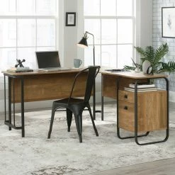 Find the motivation to tackle all your big projects when you add the rustic-inspired style and functional design of the L-shaped desk from the Sauder Station House collection. This home office desk offers a spacious top surface with ample room for your office essentials like notepads, a table lamp, laptop and hot cup of coffee. The small storage drawer opens and closes on smooth metal runners for easy-access storage of all your miscellaneous supplies. The lower drawer with full extension slides can organize letter-size hanging files. Need more? This small office desk also includes a cubbyhole area to conveniently store papers and binders. Desk includes two desktop grommets for cord management. Attractive from every angle, this L-shaped desk with storage is finished on all sides for versatile placement. Finished in Etched Oak and detailed with a textured, powder-coated metal frame, this industrial desk will inspire you to work.