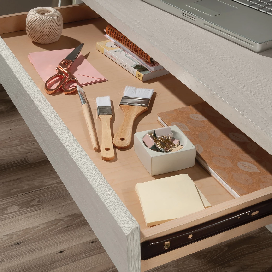 Create your grocery list, work from home, or finally write that novel on your new single pedestal desk from the Sauder Summit Station collection. This home office desk with drawers offers a spacious top surface that provides you with the space you need for office items like your laptop, stacks of notepads, folders and your hot cup of coffee.