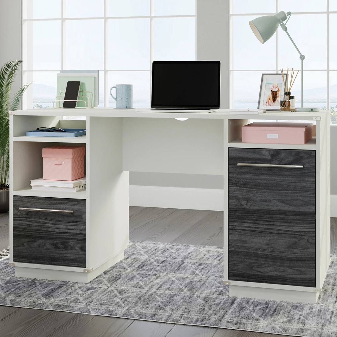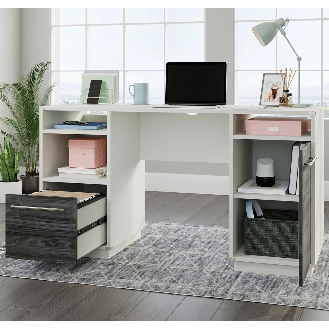This pedestal desk features a storage area behind door with an adjustable shelf for customizable storage options for books, binders, pads of paper, and more. The lower file drawer features full extension slides and holds letter-size hanging files so your most important documents are organized and easy to find. Finished on all sides for versatile placement, this desk with open storage will look polished from every angle. A Pearl Oak finish with Misted Elm accents, and metal corner brackets and drawer pulls, makes this computer desk with shelving the upgrade your home office has been asking for. Model: 431212.
