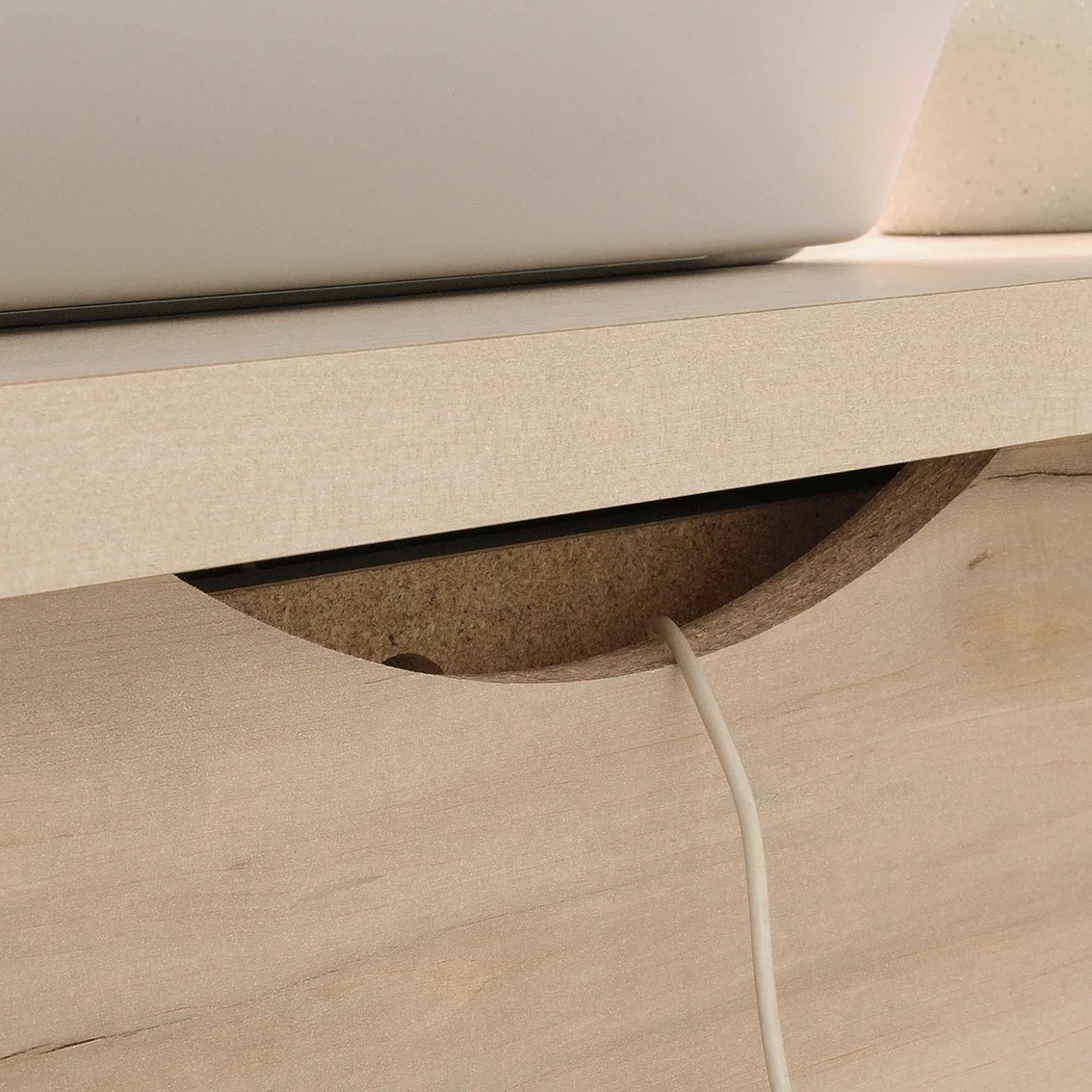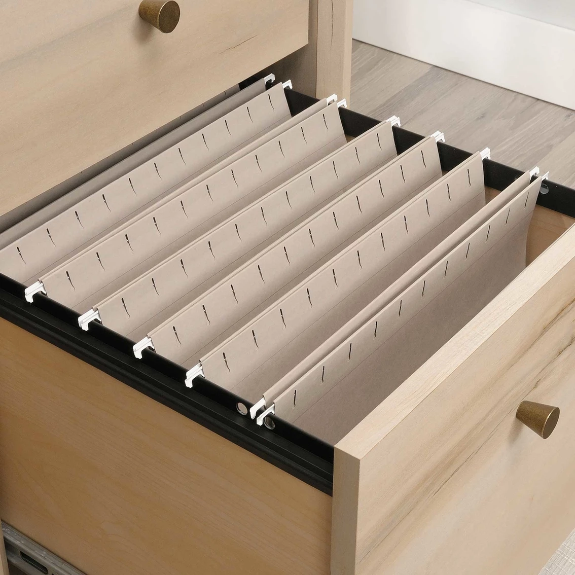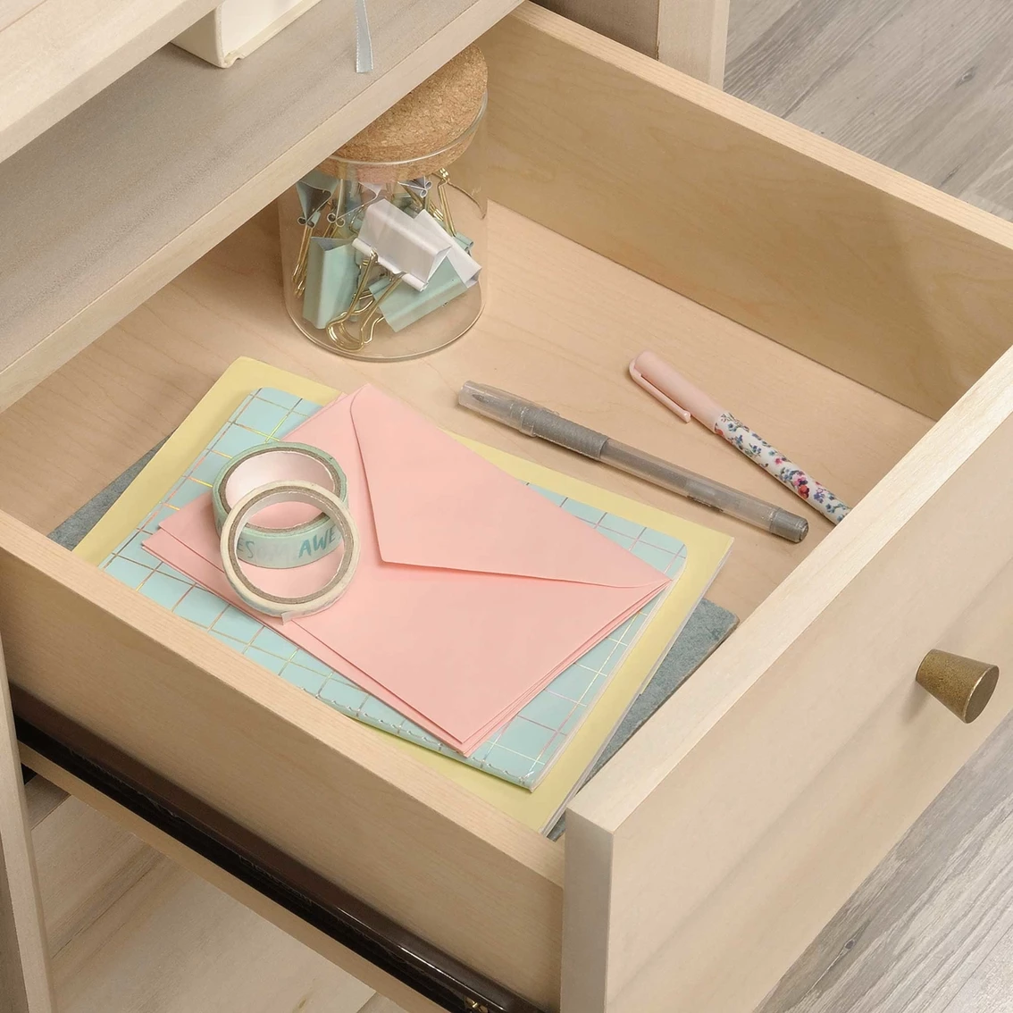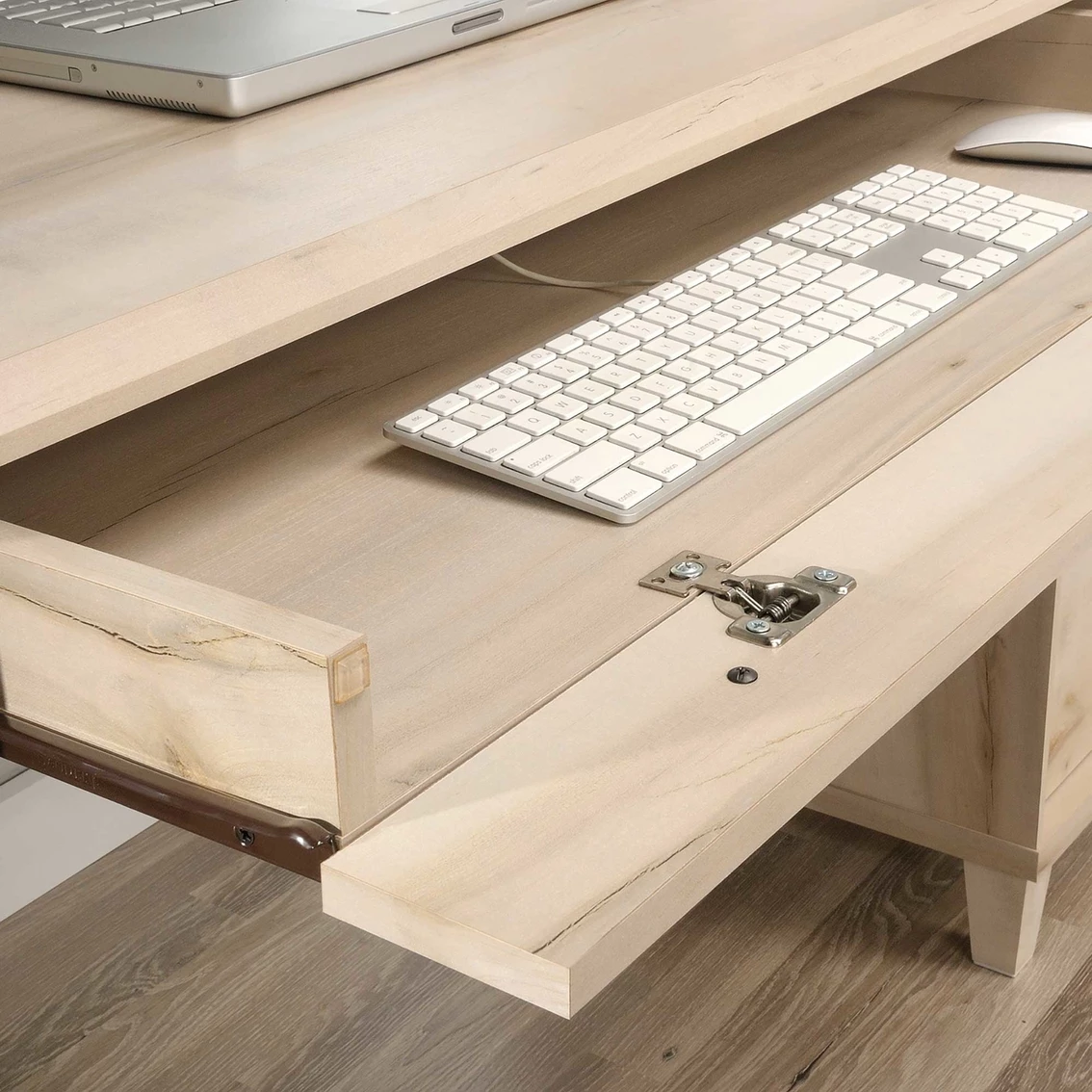 Creating a stylish home office has never been easier. Get motivated to tackle all your big projects when you add the charming style and design of this desk from the Sauder Willow Place collection. This home office desk offers a spacious top surface that provides you with the room you need for items like your laptop, stacks of notepads, folders and even a little home dΓ©cor too. The drawer/shelf features a flip-down panel for your laptop or keyboard and mouse. The small storage drawer opens and closes on smooth metal runners for easy access storage of items like envelopes and stamps. The large lower drawer with full extension slides holds letter-size hanging files for increased organization. Need more storage? The open cubbyhole area provides a space for easy access storage of miscellaneous supplies. Finished in Pacific Maple and accented with tapered feet and soft chamfered edges, this gorgeous work desk will have your home office space looking top notch.
