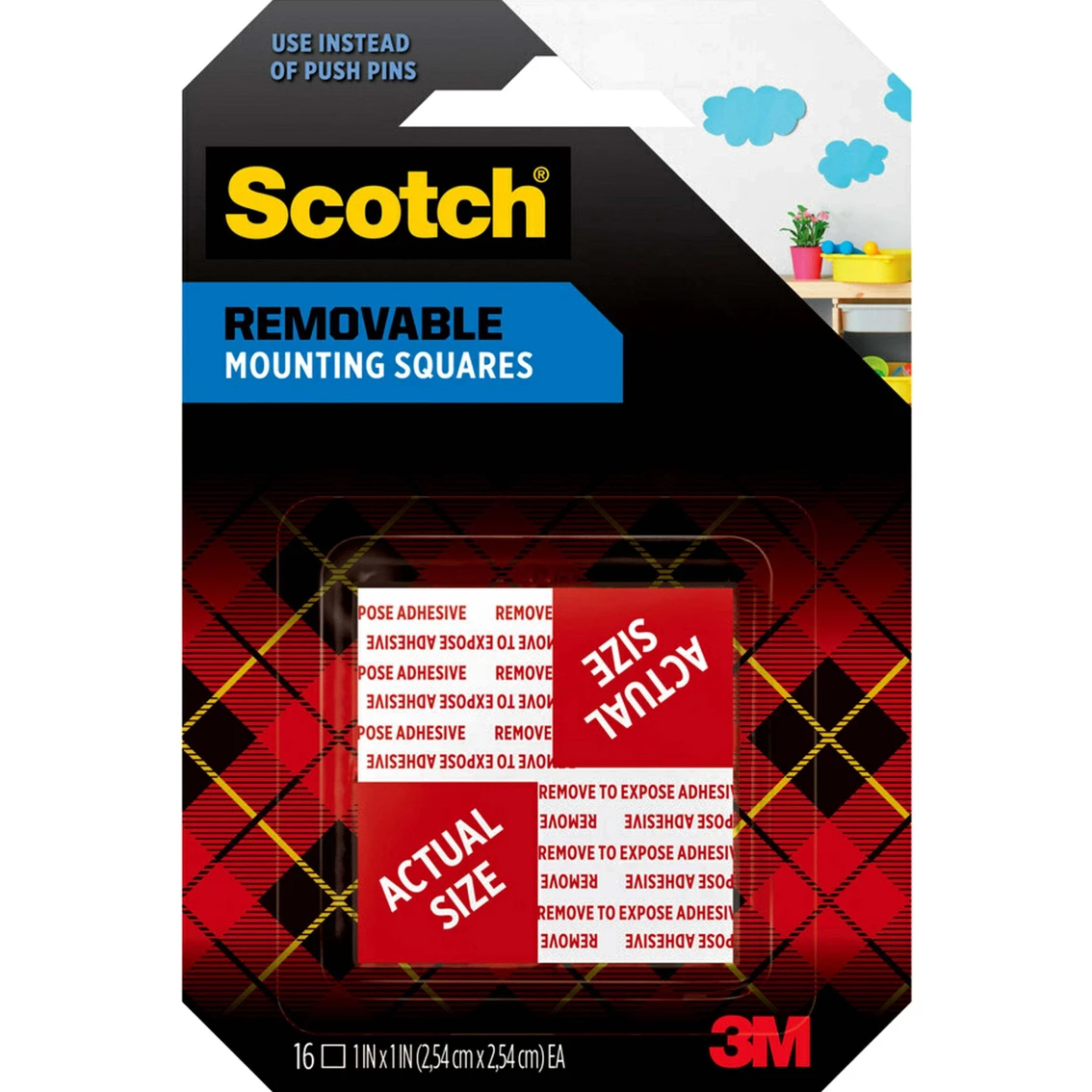 Change your decor as quickly as inspiration strikes with Scotch Removable Mounting Squares. These convenient, double sided squares let you mount your favorite photos, that doesn’t damage your surfaces when it’s removed. They’re compatible with a variety of surfaces, from your walls and your child’s locker, to your office window. So, keep on creating without regret with the undetectable secret assistance of Scotch Removable Double-Sided Mounting Squares. Use instead of push pins to keep your surfaces looking great. Removes easily without leaving any residue on ideal surfaces. To hold 1 lb. use eight squares. Designed for hanging and securing lightweight items including artwork, photos and cards. Ideal for use on painted drywall, finished wood, metal, acrylic, tile, glass and dry erase. Photo-safe (determined in accordance with ISO Standard 18916). Pre-cut foam squares for easy, mess-free application. Ensure your surface is smooth, clean and dry for the best bond. Not recommended for use on wallpaper, delicate surfaces or walls painted with flat paint. May damage some substrates upon removal. Made in the USA with Globally Sourced Materials. Size: 1 x 1 inches. Color: Black.