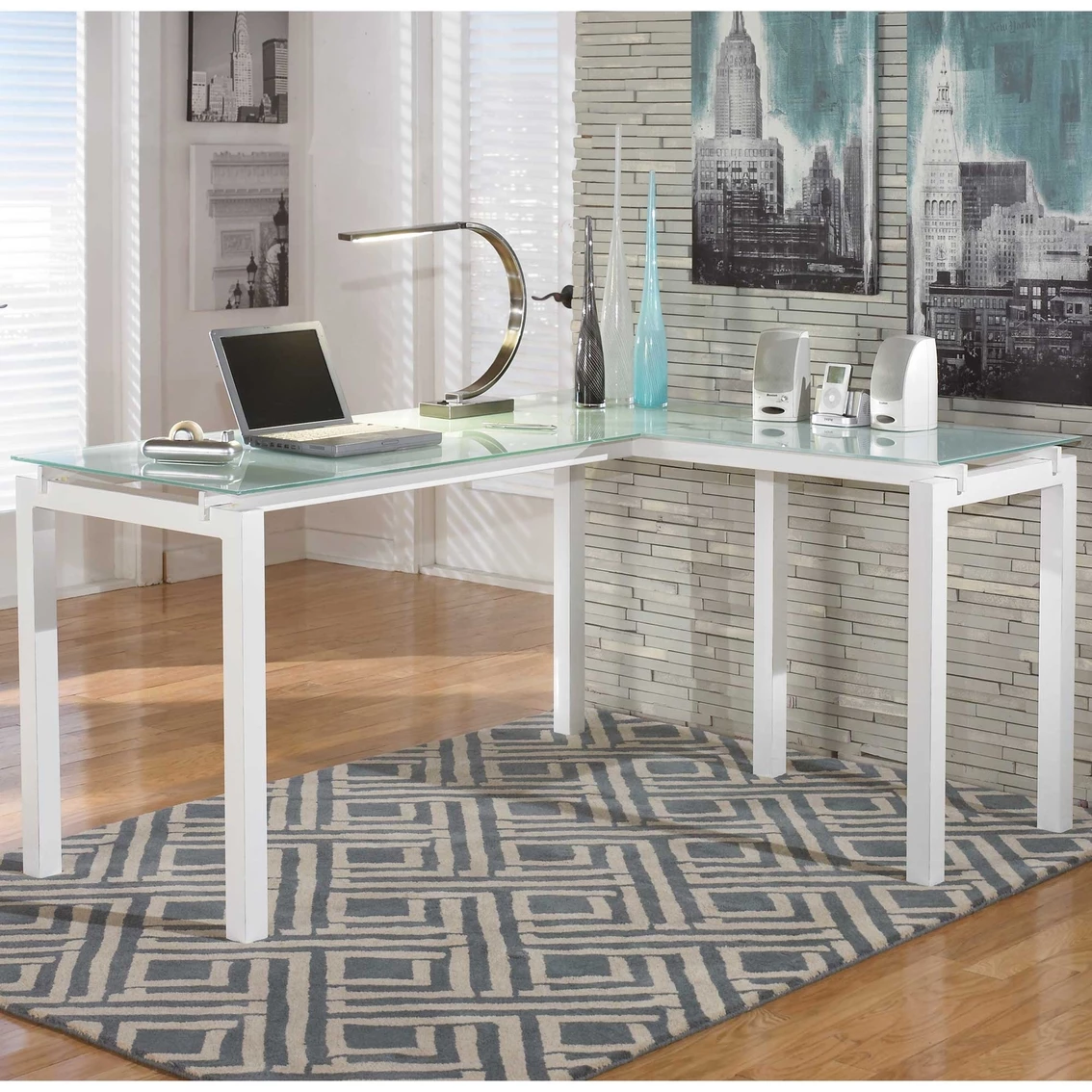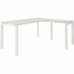 The Baraga L-desk from Signature Design by Ashley delivers the functionality you crave with the modern style that suits your taste. Frosted glass appears to float over the streamlined metal base. The desk’s L-shape design sets up two different ways, enabling left-handed and right-handed users to maximize their workspace. Featured item is desk only; images show options. Assembly required. Model: H410-24.