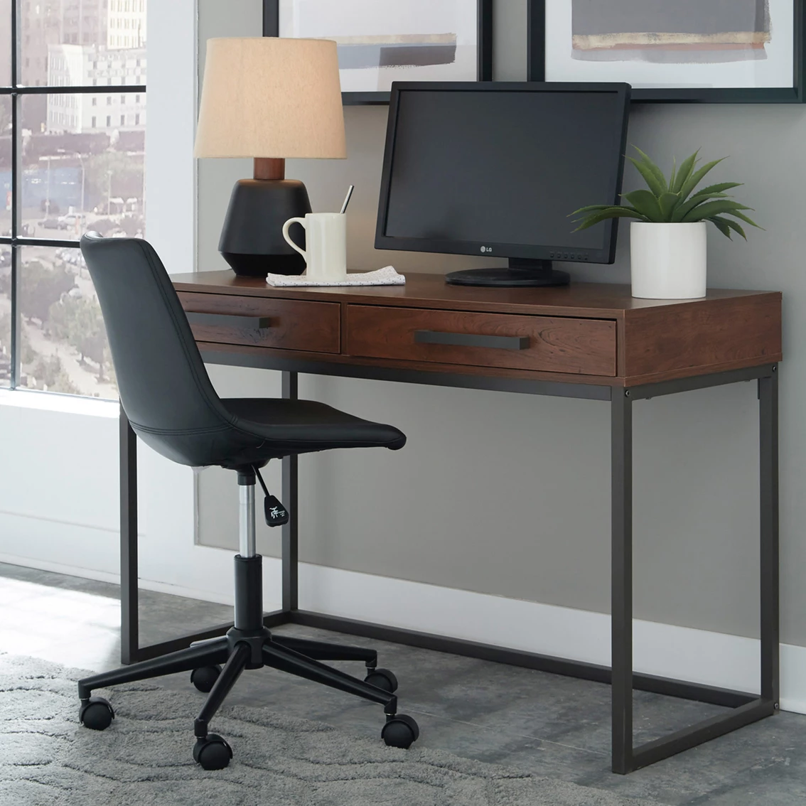 Despite its relatively modest scale, the Signature Design by Ashley Horatio Home Office Desk is packed with potential. The simple parsons-style desk features a double-drawer design, perfect for keeping supplies out of sight while still close at hand. Best of all, its timeless aesthetic merges classic and contemporary elements with ease. Assembly required; instructions included for ease of assembly. Assembled dimensions: 47 in. W x 20 in. D x 30 in. H. Model: Z1610999