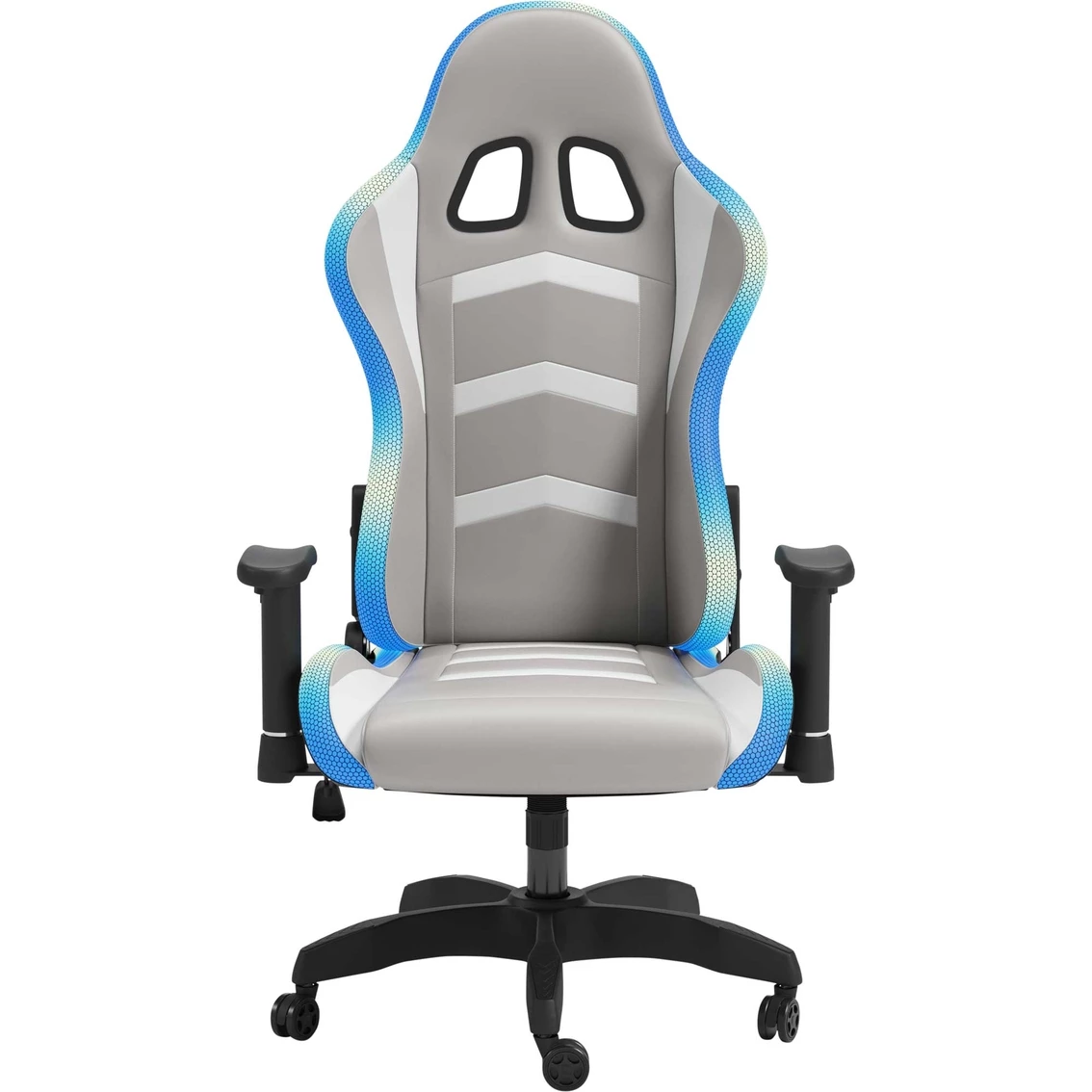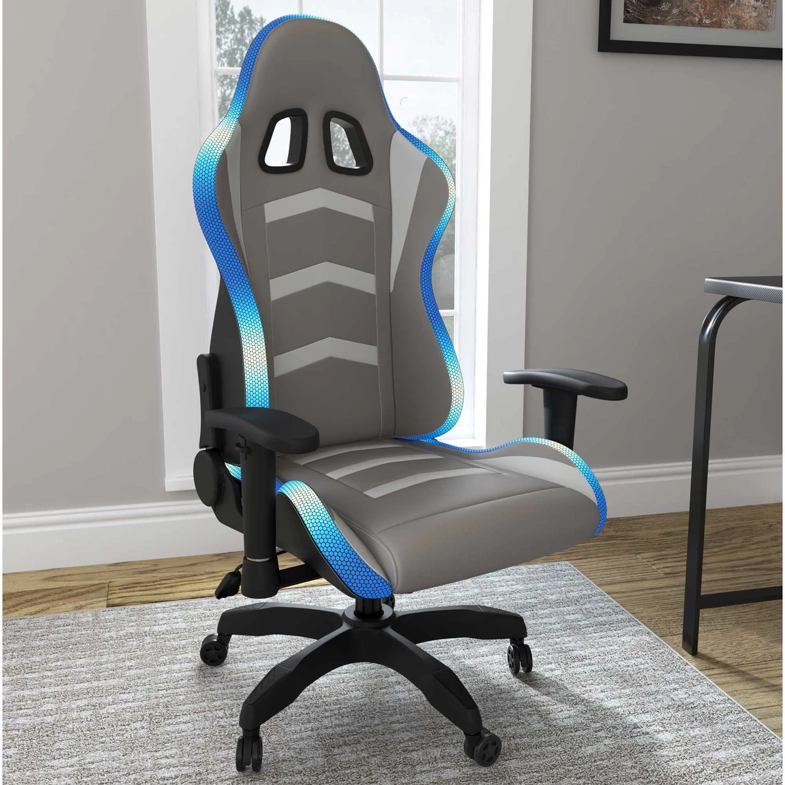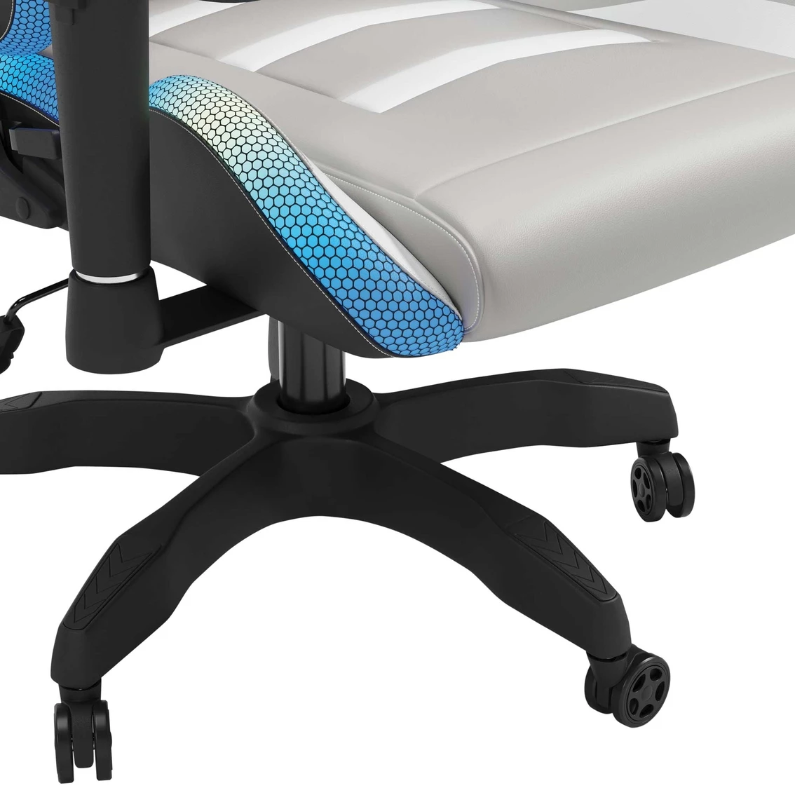 Tech this out! A swivel office chair that’s as cool as it is comfortable. The ultimate choice among gamers, the Lynxtyn swivel office chair from Signature Design by Ashley is hard to beat. Quality crafted with a sturdy steel frame, this swivel office chair with comfy contoured seat and cutting-edge design is upholstered in a durable faux leather in white and gray. Cleverly integrated into the chair: powered LED lighting to enhance the gaming experience. Choose from six different colors or stream a mix of color using the remote control. With a swivel base, smooth-gliding casters and adjustable seat height/tilt feature, this office chair with fully reclining backrest has serious game. Includes 1-meter long USB power cord and wall power adapter. For wire-free power, use the convenient pocket on the back of the chair to place a portable power bank (power bank not included). Featured item is chair only; images show options. Assembly required. Model: H400-08A.