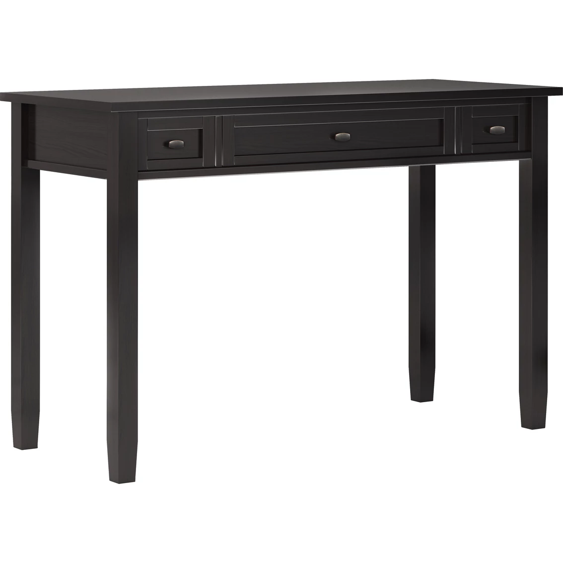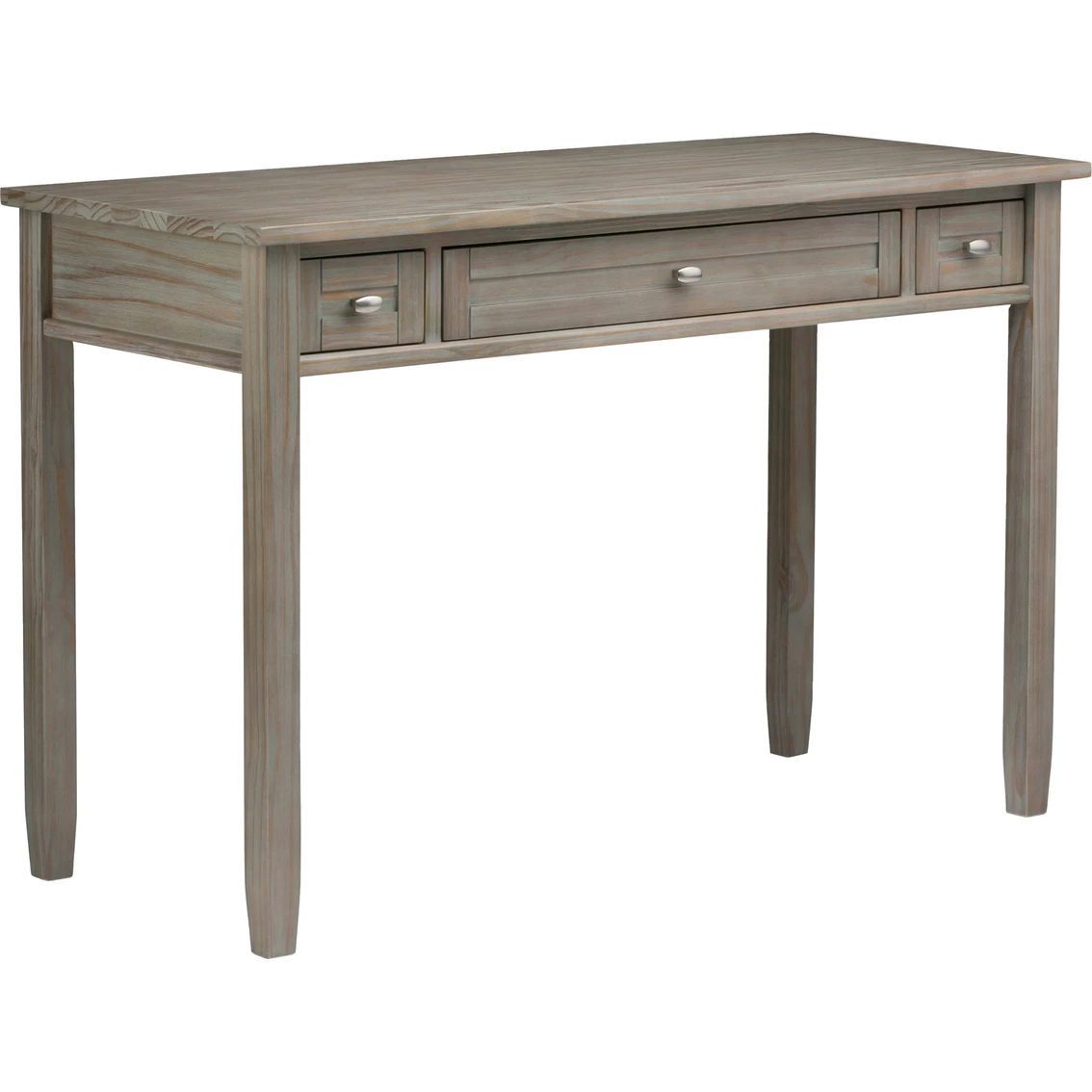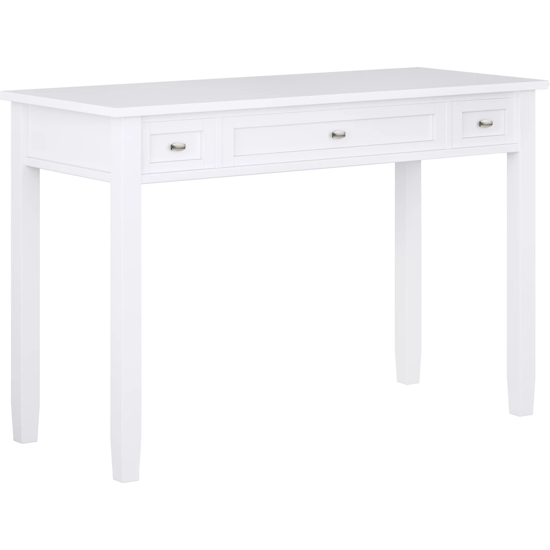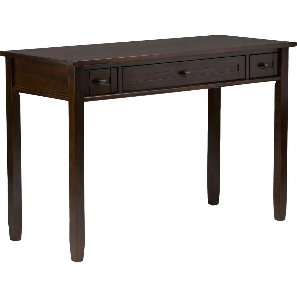 You don’t have to avoid going to the office ever again. Enjoy comfortable computing and work from home or office with the Warm Shaker Desk from Simpli Home. Its large surface area is ideal for a monitor, laptop or tablet and leaves enough room for paper, books and other writing accessories. It features a pull-out keyboard tray behind a flip down shaker drawer front plus two side drawers for additional storage space. Ideal for the home office or living room settings. Model: AXWSH010.