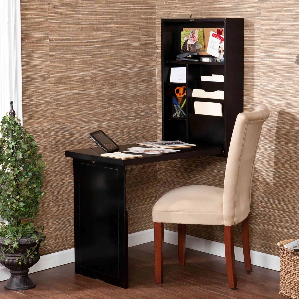 An ideal solution for any room, this SEI walnut writing desk folds away neat and compact. Fold the desk down and to reveal a convenient storage area with two adjustable shelves, bill organizers and a corkboard. Whether you choose to use this in your home office, living room, bedroom or dorm, you are sure to be pleased with the amazing functionality of this fold out desk.