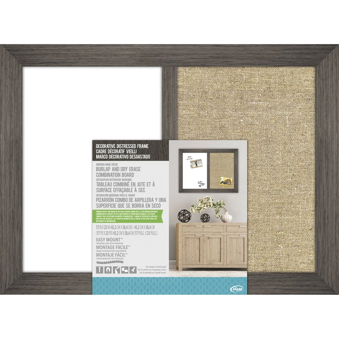 The Board Dudes Combo Dry Erase and Bulletin Board 17 x 23 in. comes with a decorative distressed 1.5 in. wood frame. One half is a dry eraser board, the other half is a burlap bulletin board. Includes Easy Mount measuring strip and hardware for mounting. Model: FHD82.
